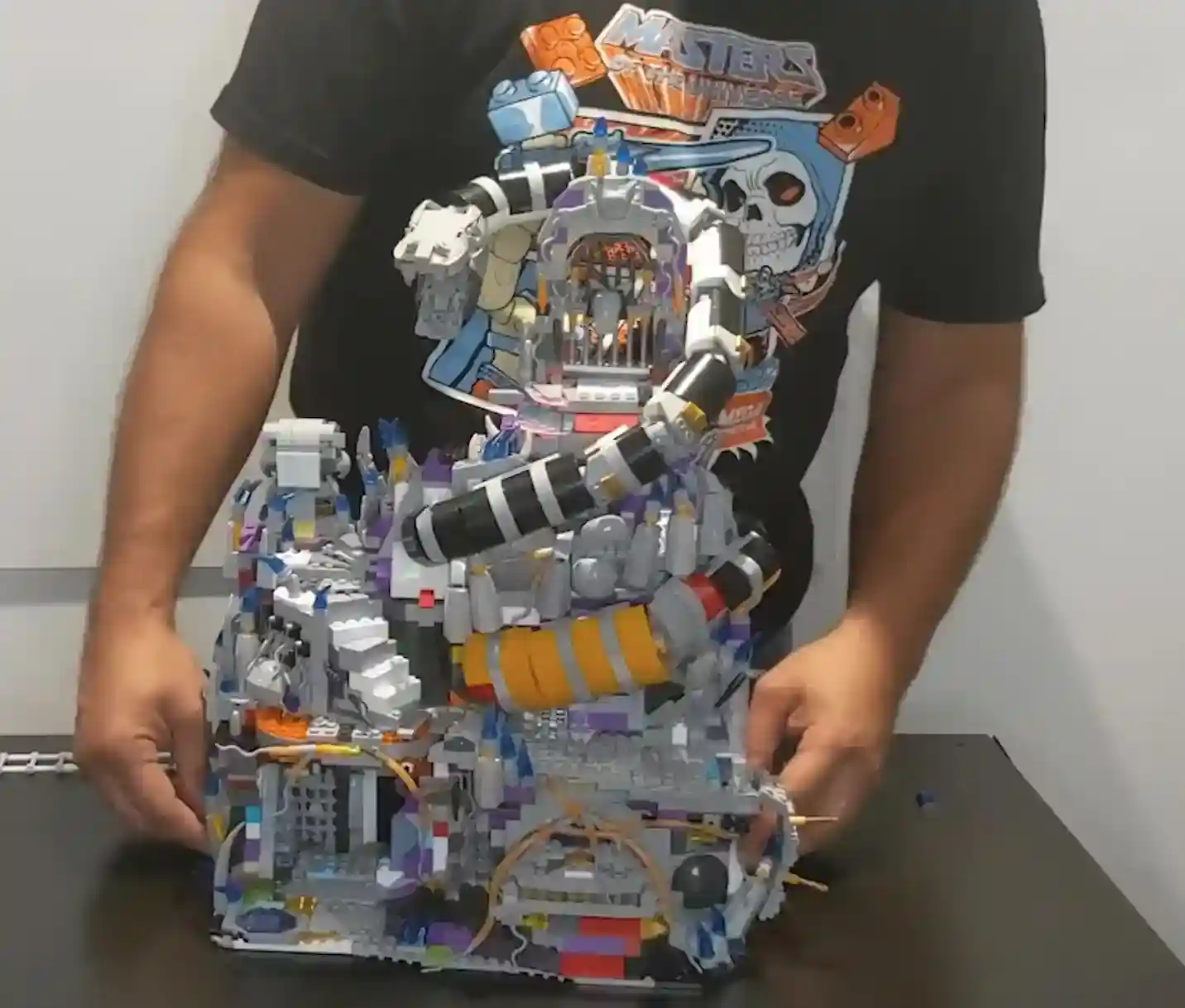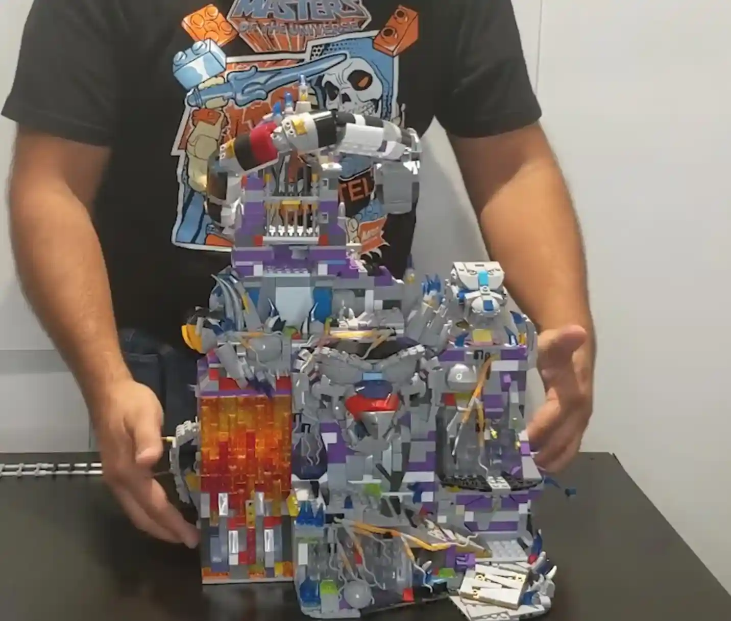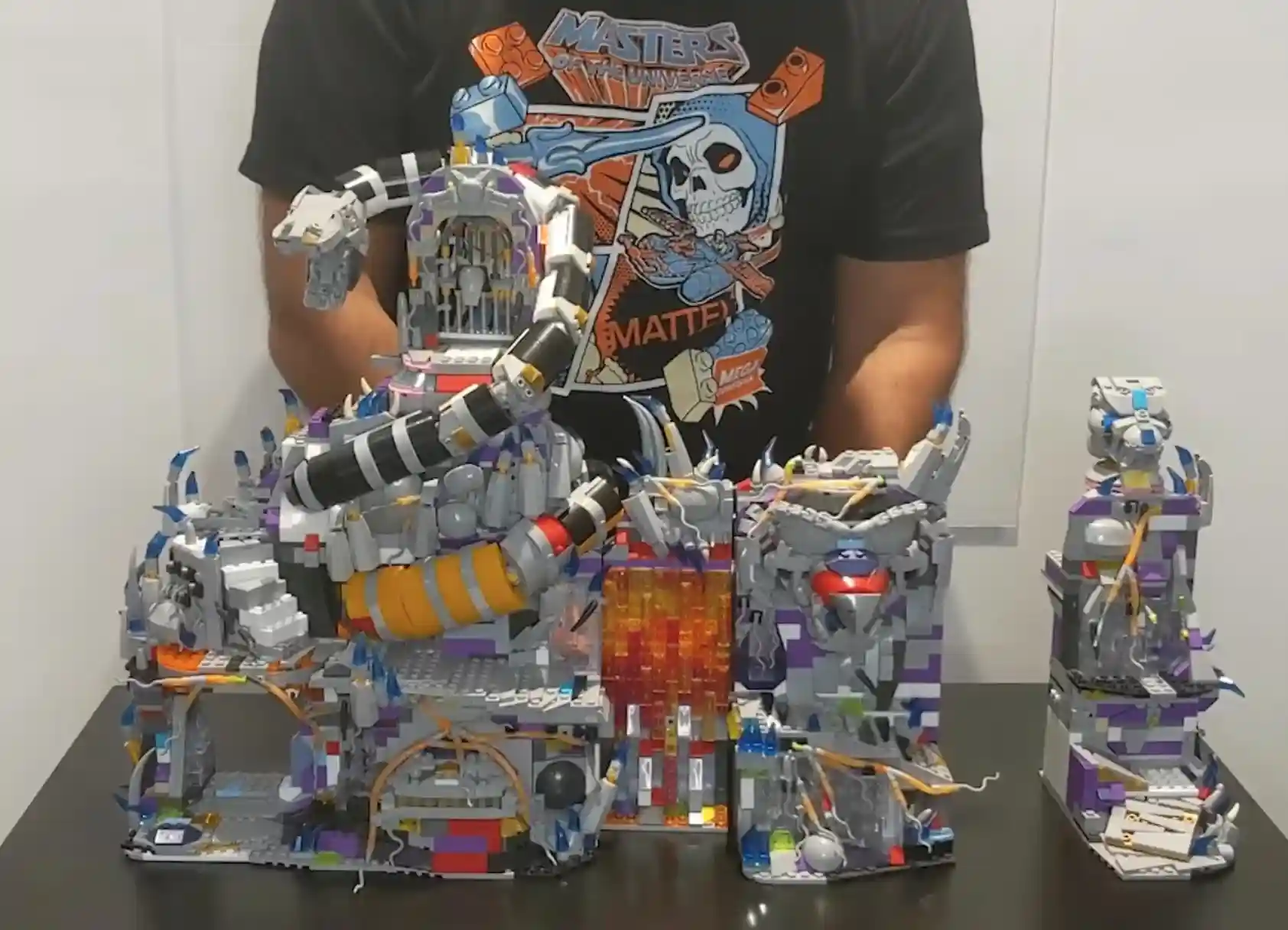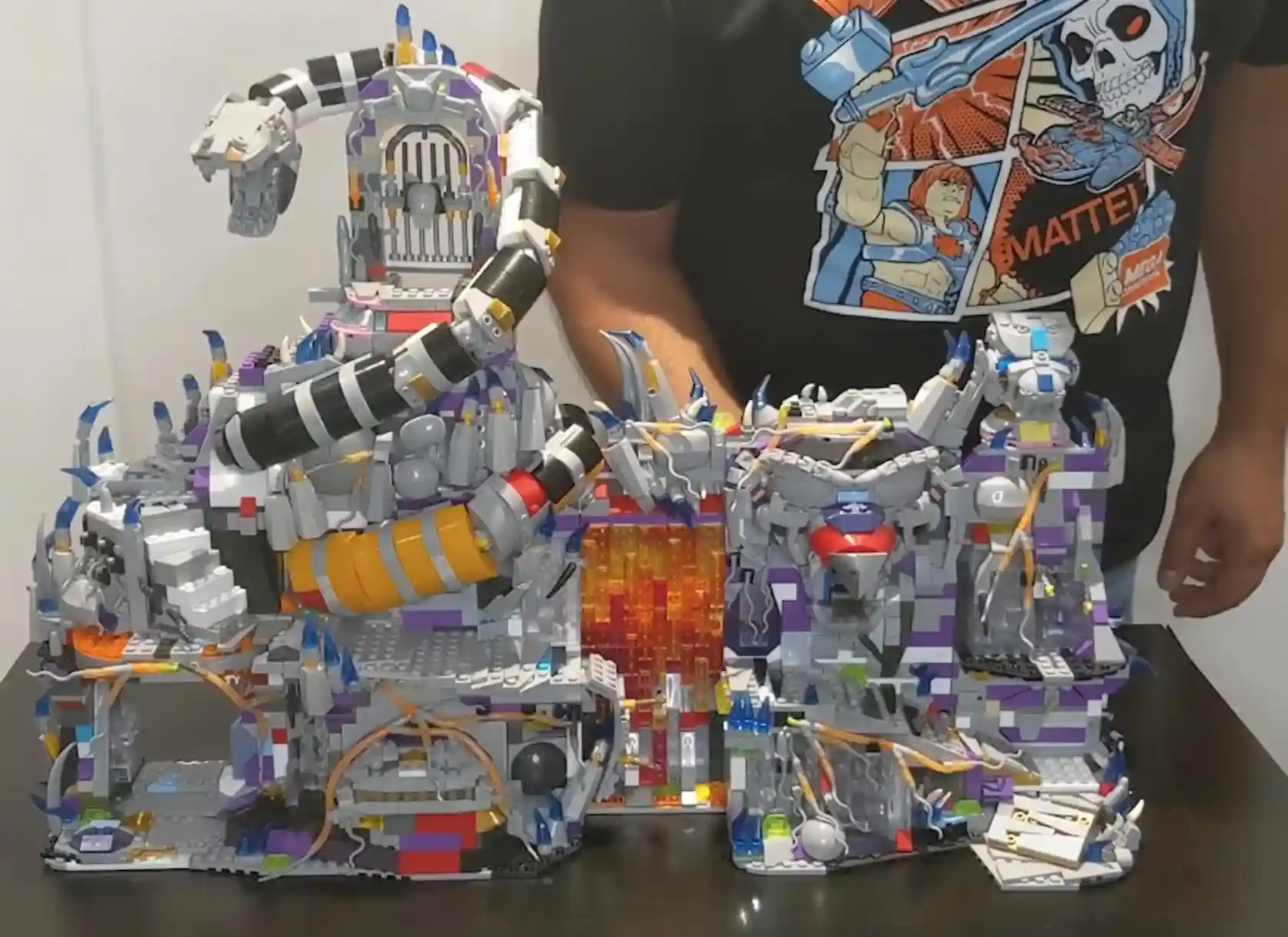 When the Mega Construx team first revealed the prototype of Snake Mountain, they said, “if you like Castle Grayskull, you are gonna love Snake Mountain” and I have to agree with them! The inspiration of the design harkens back to the vintage toy and they said they are even including stickers to ensure that nostalgic feel of first opening Snake Mountain and putting it together. Using multicolor bricks just to illustrate the size, shape and layout of a potential Snake Mountain, the team said this set was in the validation stage so the colors do not represent what the real Mega Construx Snake Mountain will look like and we can’t wait to see what the actual official images look like. It has so many cool features, including detachable modules, stickers that you can apply (or misapply in my case lol), the serpent, the coiled snake that wraps around the mountain, and the demon head (the mouth actually moves like the vintage MOTU Snake Mountain. Inside Snake Mountain you can stow some very cool display pieces like the bone chair (how cool is that!!!), the table, and the tentacle monster!