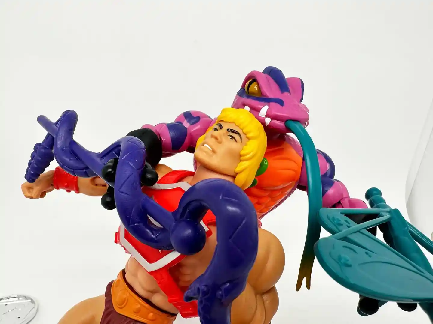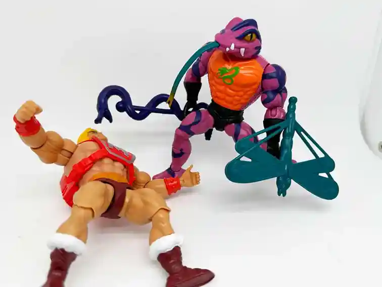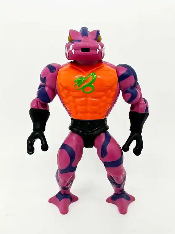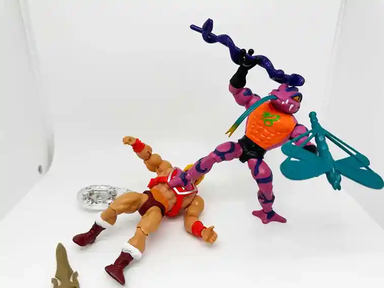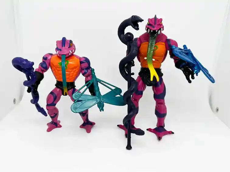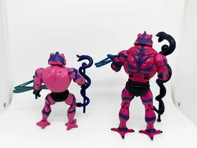 As you can see, Mattel did an excellent job in recreating the look and charm of the vintage Tung Lashor figure, but with modern MOTU Origins 16 points of articulation. The one glaring difference between the two is the lack of the action feature on the MOTU Origins one. Obviously, the design of the new Tung Lashor now has a ball jointed neck so he can look up, down and all around, where the vintage’s head didnt move because the tung action feature was activated through the mouth by scrolling the wheel on his back. So, in one case we get a fun tongue “lashing” action feature on the vintage figure, but on the other hand, we get all the modern posing and interchangeable parts we have come to expect and love out of the MOTU Origins figures. So, which do you prefer? Guess to each their own. For me, the jury is still out!