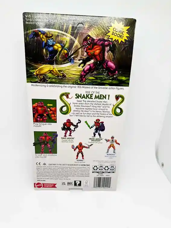 Tung Lashor is featured on the Rise of the Snake Men card, like others in Wave 12. It has the cool Rise of the Snake Men logo over the classic Masters of the Universe logo, and the added scales sculpted on the front of the plastic blister bubble. The rear of the package features card art with Tung Lashor in a boggy swamp, locked in a duel with none other than the yellow and blue heroic tornado, Sk-Klone. Let’s hope this is a tease that perhaps Syklone is coming to the line? Be sure to check out our Wave 12 card art teaser article for more insight: MOTU Origins Wave 12 Card Art Teases Two Bad, Sy-Klone, & Bashasaurus (toyhabits.com)