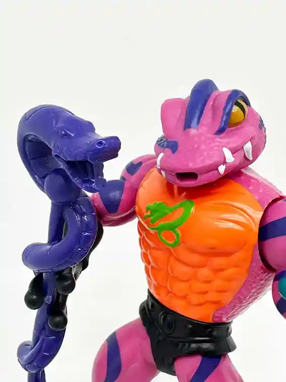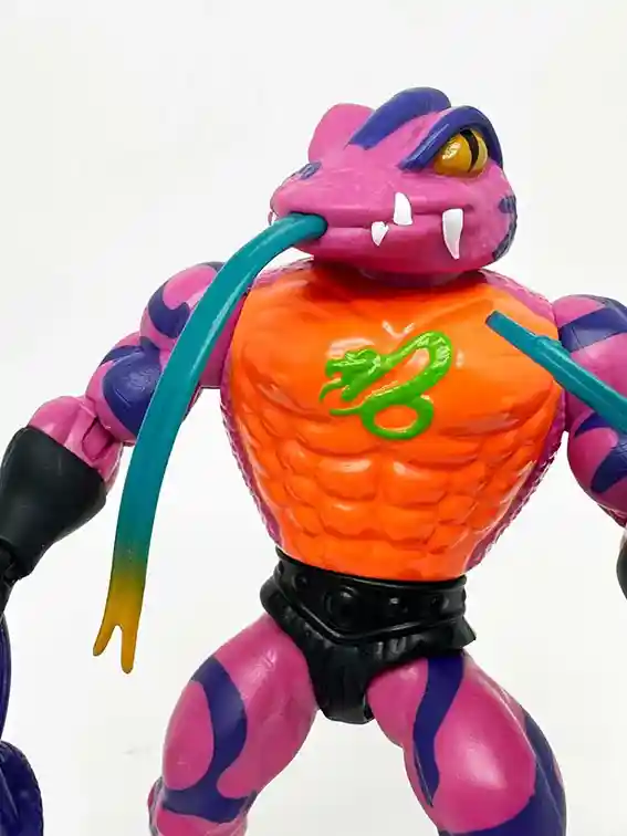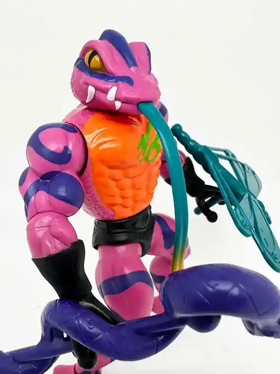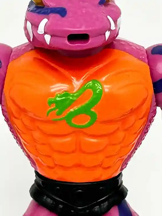 Tung Lashor’s chest is a bright orange color, sporting the Snake Men logo in green on his chest. His back is the same bright pink skin color with various reptilian texture and markings molded on his back. Unlike the vintage figure, this version of Tung Lashor does not include the dial on his back to make his tongue lash out. Rather, we now get a smooth and uninterrupted look to his back.