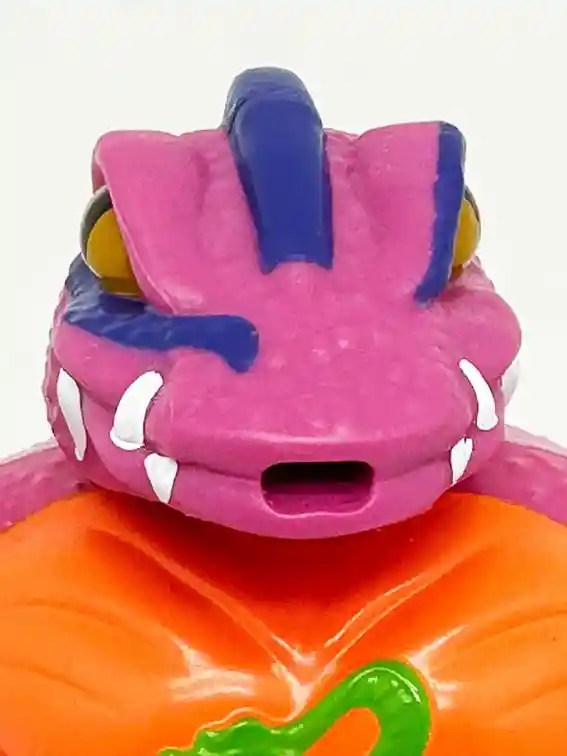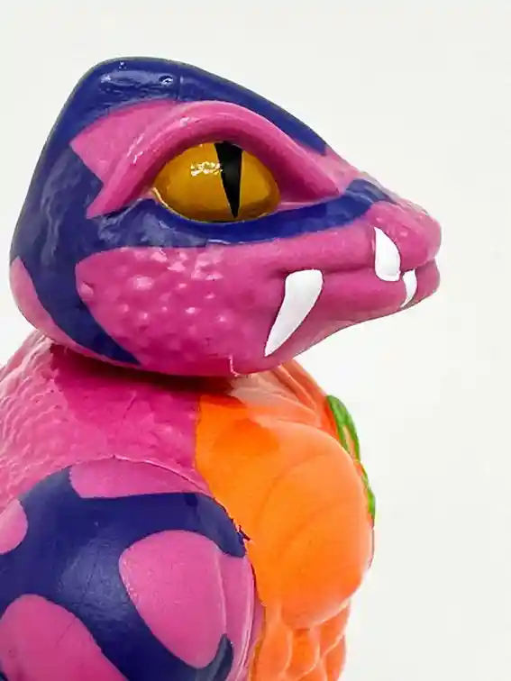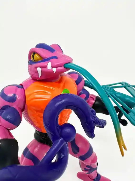 Tung Lashor’s head just like his vintage counterpart. With the bright pin skin, purple striped accents, yellow piercing eyes and fangs at his smirking mouth, he really captures the look and charm of the vintage figure.