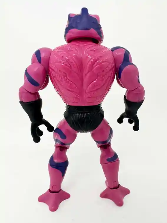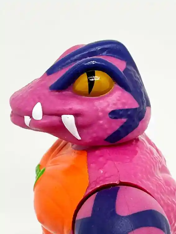 In classic MOTU Origins fashion, Mattel did an amazing job capturing the charm and vintage look of the figure. Looking more like a poison dart frog, then anything in the Snake family, Tung Lashor was the brightest and cutest of all the Snake Men! His bright pink skin color, purple strips and gecko like hands make him look so adorable in my opinion! He looks great all geared up with his crossbow and purple snake staff! As you can see, there is no dial on his back, so we get a nice clean sculpt for his MOTU Origins figure.