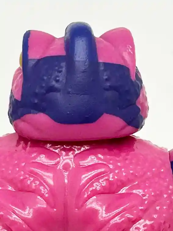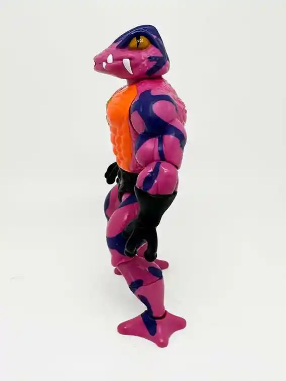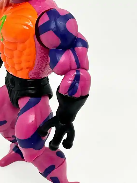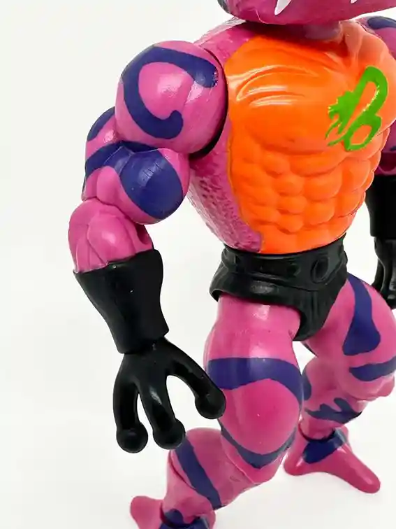 Arms: Tung Lashor uses the standard MOTU Buck shoulders and fore arms, but when it comes down to his lower arms, those are a new sculpt for the Origins line! His arms are in the same bright pink color with purple strips throughout. But his wrists and hands resemble that of a tree frog or gecko with a three fingred, webbed design in black.