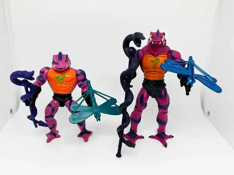Here we can see the MOTU Origins Tung Lashor next to the MOTU Classics version. They are very similar in style, both without any action feature, but the Classics version came with swappable heads, rather than a tongue insert. But in either case they both resemble their vintage counterpart.