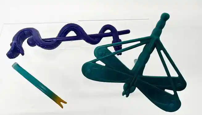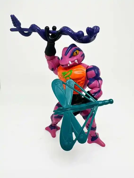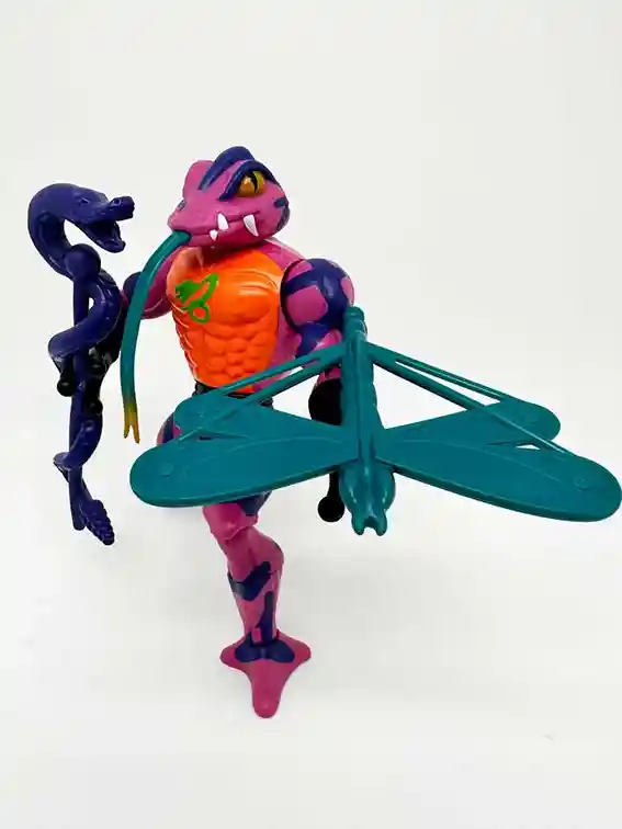 Tung Lashor’s cross bow resembles that of the vintage figure. It resembles a dragon fly, which is typically something that frogs eat. It is molded in a teal plastic color, and has a stick handle for him to hold onto it.