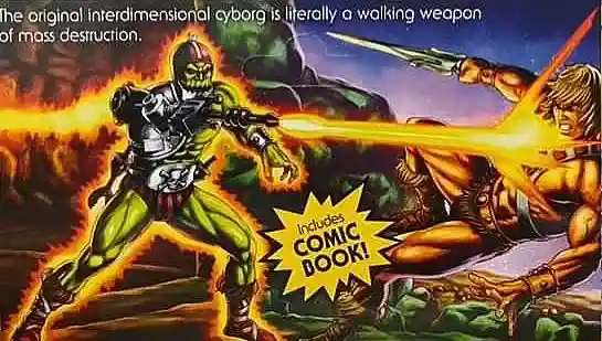 Here we have Mini-Comic Trap Jaw fighting against He-Man and blasting him with his weapon of mass destruction arm laser.