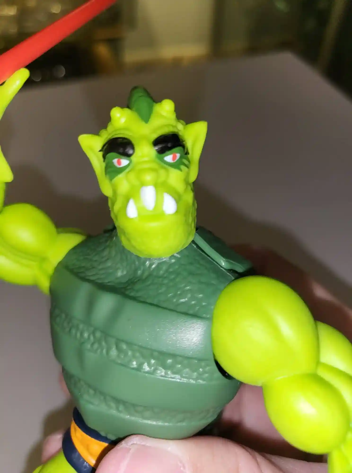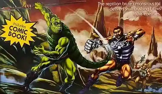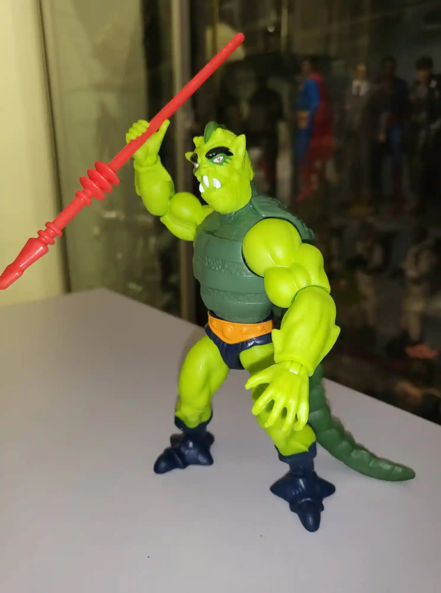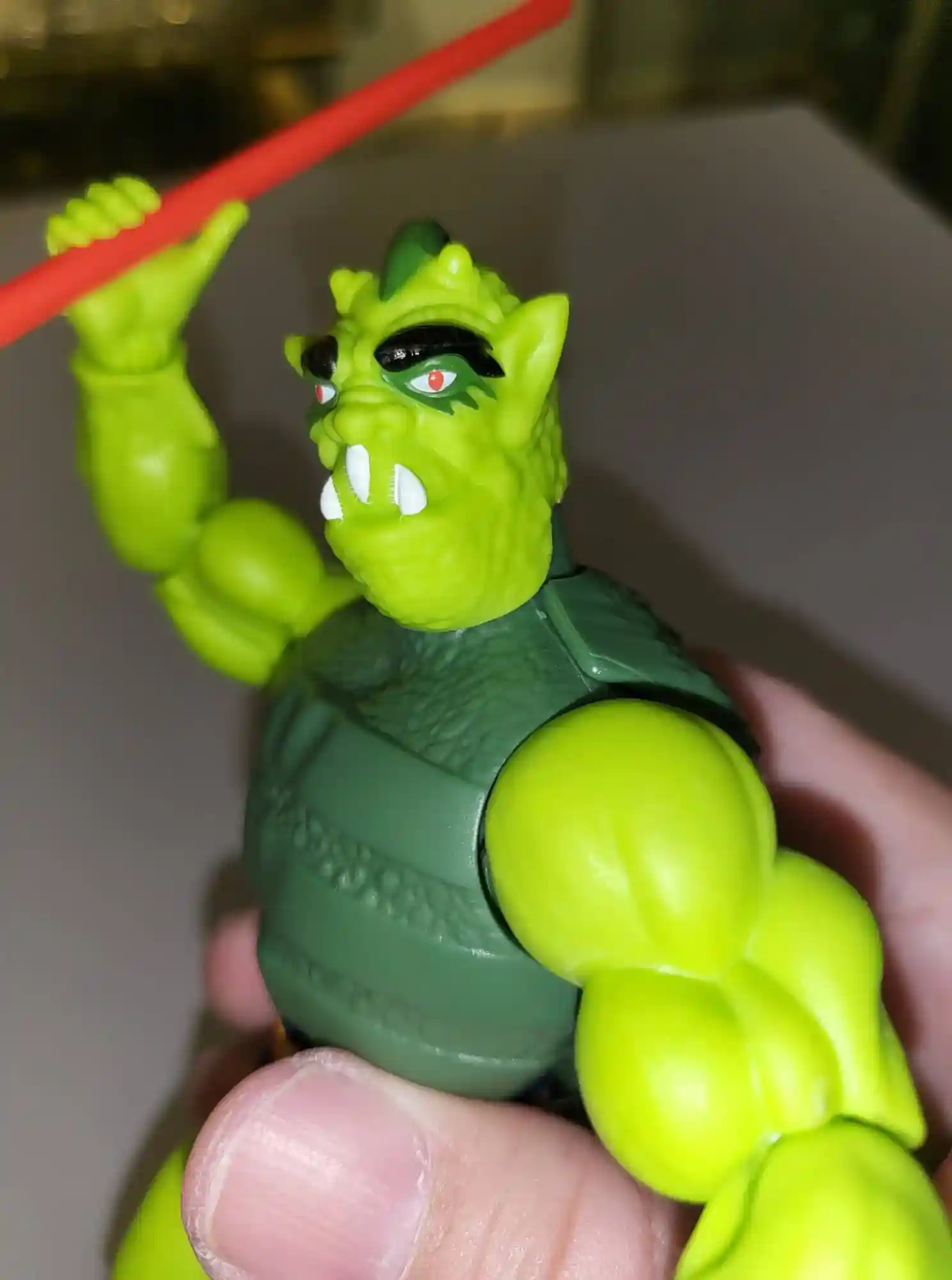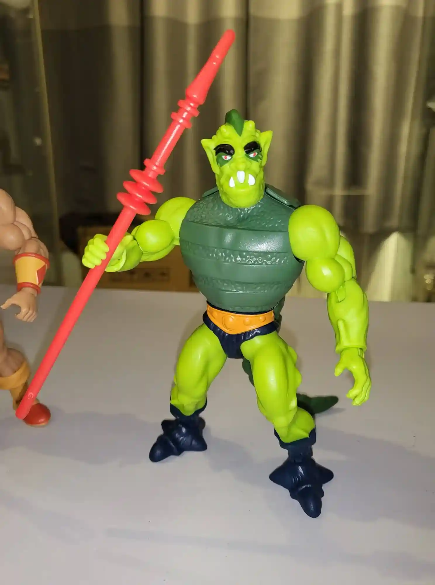 Once thought to be a mythical race, the savage looking Kulataks allied themselves with King Randor after Skeletor attempted to steal Eternium metal from their mines. Supplying the Masters of the Universe with this precious metal, the Kulataks helped build a new prison for Skeletor’s Evil Warriors. King Chooblah later joined Randor’s new Eternian Council, helping to unify the free people of Eternia against evil. Chooblah took up arms himself during the Second Ultimate Battleground, leading three battalions of brave Kulatak warriors against the Snake Men and Horde armies. Their attack was the key to defeating King Hssss and destroying the Horde war machines. Wise leader of the Kulatak warriors, King Chooblah uses his claws and great strength to defeat evil enemies!