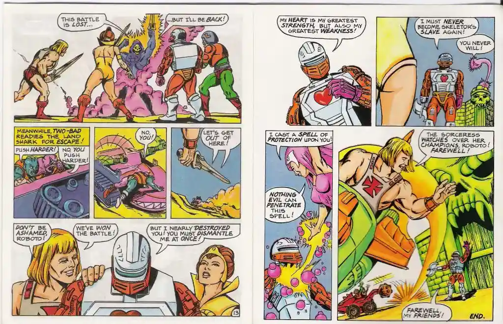 If you are not familiar with this particular version of Roboto, he comes straight from the MOTU vintage mini comics. As you can see in the comics, Roboto’s translucent chest is actually solid and you can’t see through it. It also appears as Roboto’s heart is displayed on the outside. In the mini comic, there are no gears and in other pictures his heart is not displayed but only because his heart is not inside him.