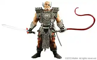 The reveals at the 2013 Power-Con were pretty spectacular, featuring MOTU Classics Scorpia, Battle Lion, Blade, and the epic Castle Grayskull! Revealed at Power Con 2013, Battle Lion comes decked out in bronze-colored armor with a fierce, snarling green body and a flowing dark green mane, complete with clawed front paws and a long tail. His armor includes a headpiece, chest plate, and saddle, all sculpted with angular detail and sharp edges to match his feral look. Scorpia features a striking black and red outfit with pointed shoulder armor, clawed gauntlets, and a segmented tail curling behind her. Her head sculpt captures her determined expression, topped with a red headpiece, and she’s armed with a large, scorpion-shaped crossbow, perfectly tying into her menacing Horde aesthetic.