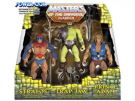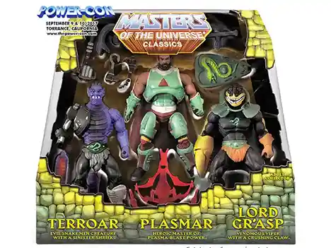 First up, created as Power-Con Exclusives, are the MOTU Classics 3-packs! Pack 1 features 8″ mini-comic variants of Stratos, Trap Jaw and Prince Adam while Pack 2 has 8″ figures of Terroar, Plasmar, and Lord Gr’asp. Both 3-packs were offered to Power-Con attendees to order as made-to-order / pre-order items. These figures are only available through Power-Con.