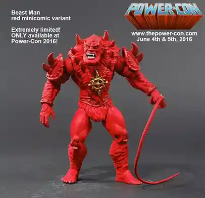 Revealed as extremely limited exclusives for Power Con 2016, Camo Khan sports a green and black camo-style body with scaly texturing, a snake-like head, and piercing yellow-green eyes. Gold accents on his boots and left forearm add contrast, while he wields a bright green serpent staff. The red minicomic variant of Beast Man features a vivid crimson fur-covered body with a fierce head sculpt and snarling expression. His armor is painted in a matching red with a gold bat emblem on the chest, and he comes armed with a long red whip, ready to lash out in classic savage style.