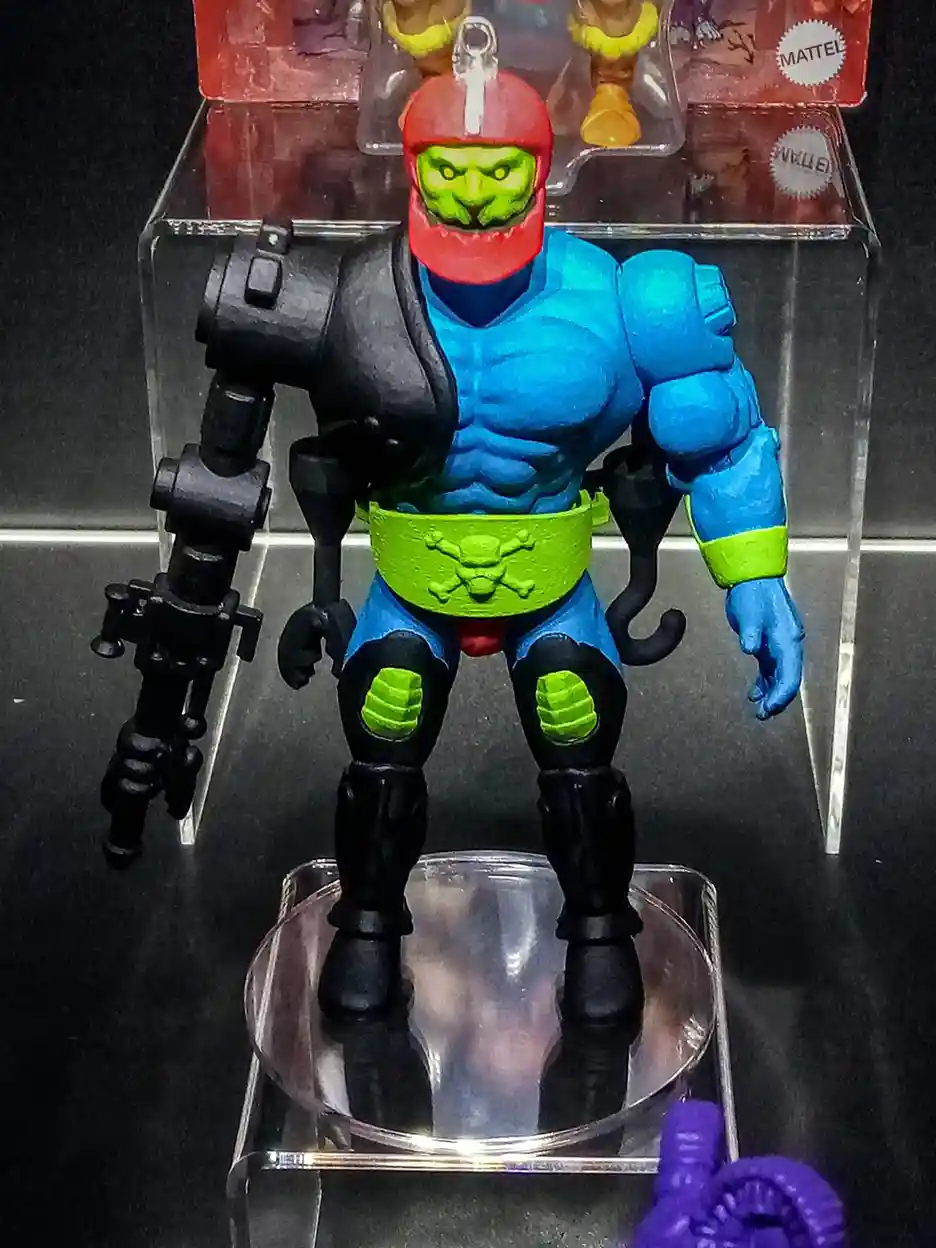 The 2018 Power Con Club Grayskull exclusives from Super7 brought Filmation flair to two fan-favorite characters. Spikor features his signature purple spiked armor and head, paired with a bright pink body and brown boots, staying true to his animated appearance. His right arm sports the silver trident attachment, and his clean, bold paintwork captures the cartoon style perfectly. Chopper, better known to fans as Jitsu, comes in his Filmation look with a bright red and yellow outfit, blue belt, and purple wristbands. His muscular build and simplified details match the animation design, and his golden chopping hand is faithfully recreated, making this exclusive duo a colorful nod to the classic series.