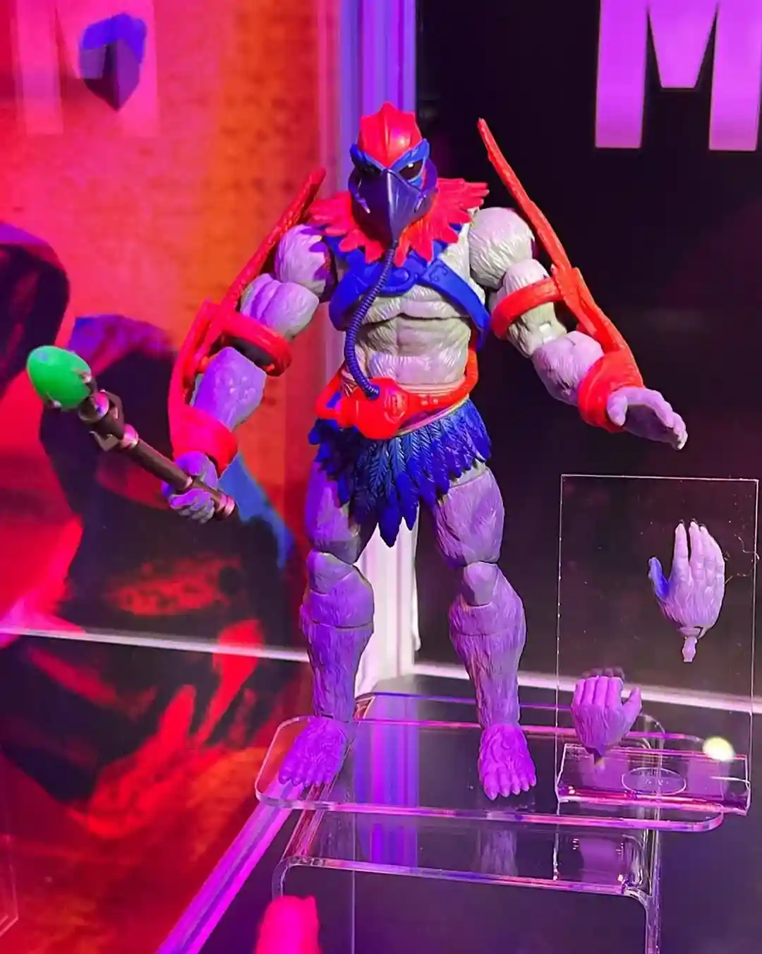 This version of Stratos has to be from the New Eternia line with the face mask that plug into this belt! It looks like this piece is removable and he also comes with his Emerald Staff of Avion, his classic red wings that go on his arms, and an extra set of hands.