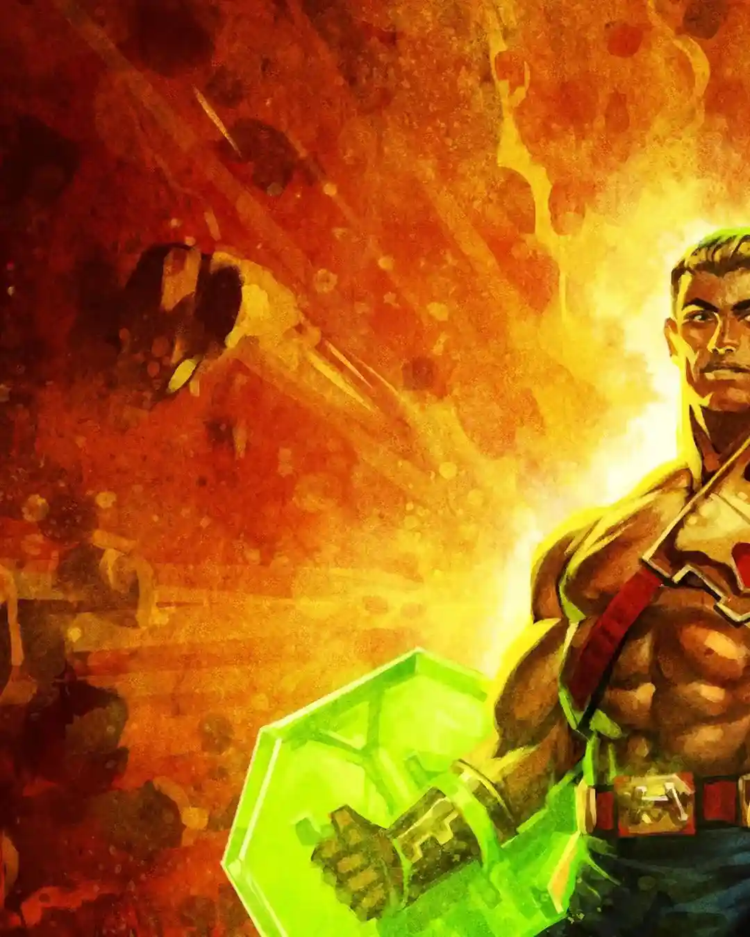 Taking a look at the side art, we get incredible artwork by @natebaertschart! We can see Galactic Protector He-Man wheedling his power sword aloft with the red busts behind him! He is dressed in his short chest armor and he is holding his sheild. The glow of the bursting red rocks can be seen behind him.