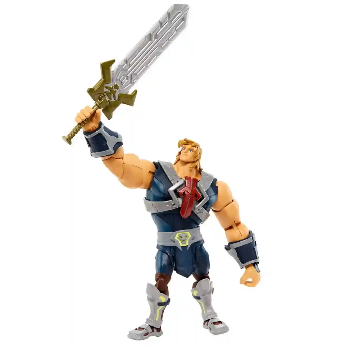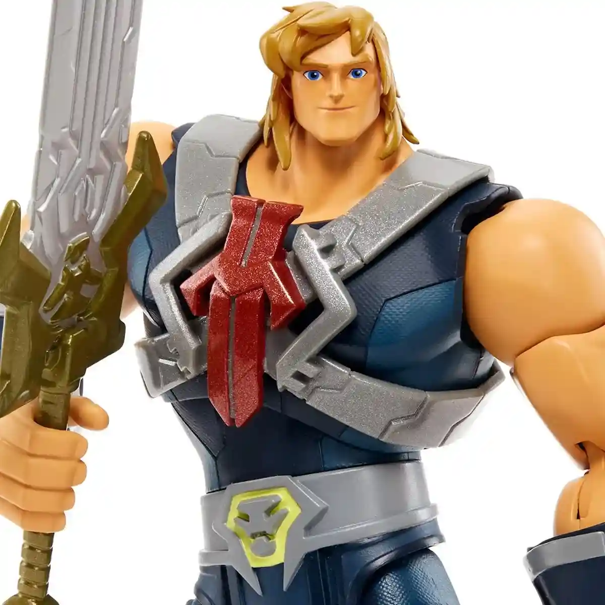 Masterverse Netflix Animated He-Man is styled after his look from the CGI series, sporting a dark blue armored suit with silver and gray accents along his chest harness, belt, gauntlets, and boots. His chest piece features a bold red emblem at the center, while his blond hair frames a youthful face sculpt that matches his animated counterpart. He’s shown holding a massive silver Power Sword with gold hilt details, striking a pose that captures the energy of the show with the blade raised high.