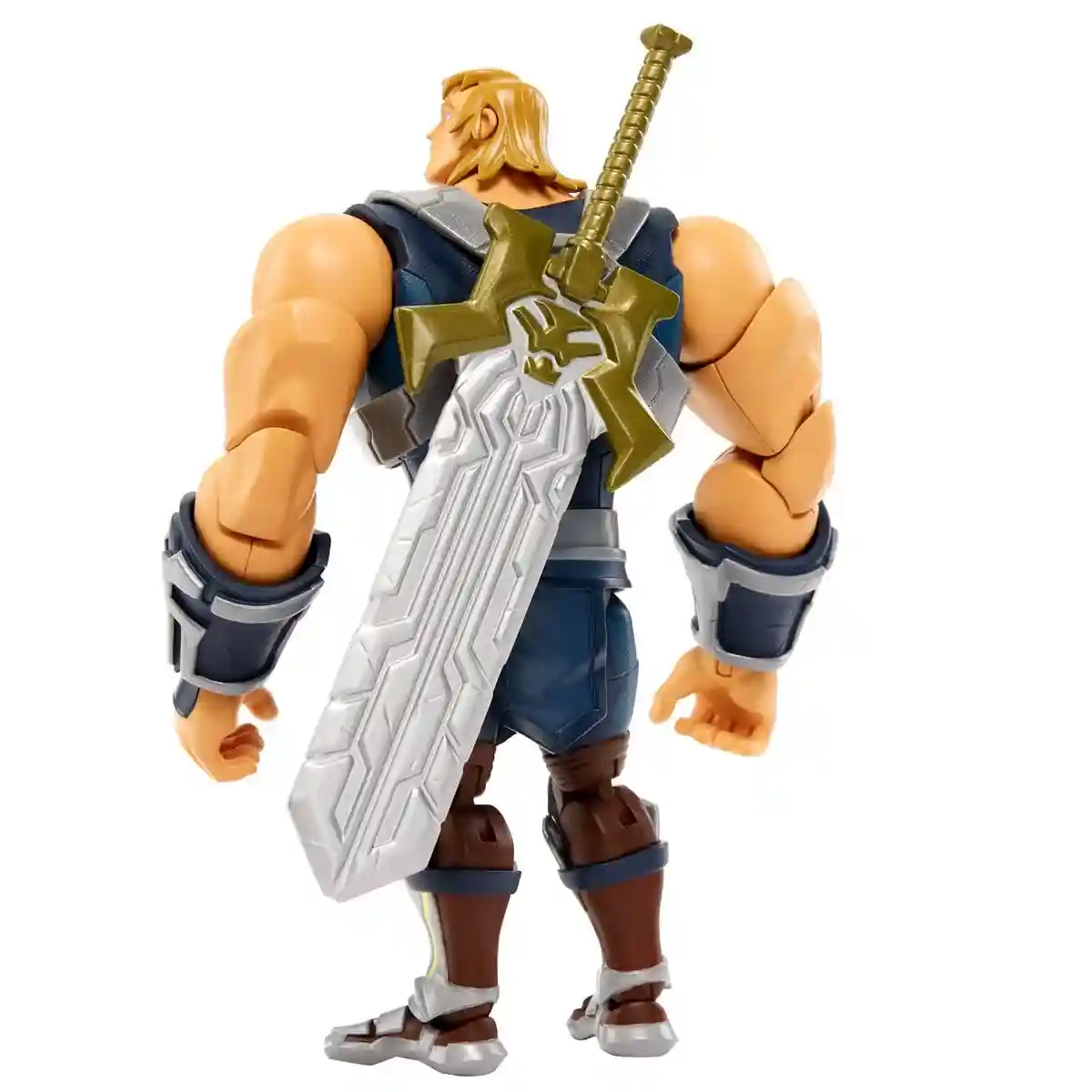 This look at the Masterverse Netflix Animated He-Man highlights how his massive Power Sword can be stored across his back when not in use, secured by the harness that runs over his chest. From the front, he grips the sword tightly, showing off the large, angular design of the blade with its silver finish and gold hilt. The figure’s armored details on his gauntlets, belt, and shin guards pop against the dark blue suit, while his youthful face sculpt and flowing blond hair keep him true to his animated design.