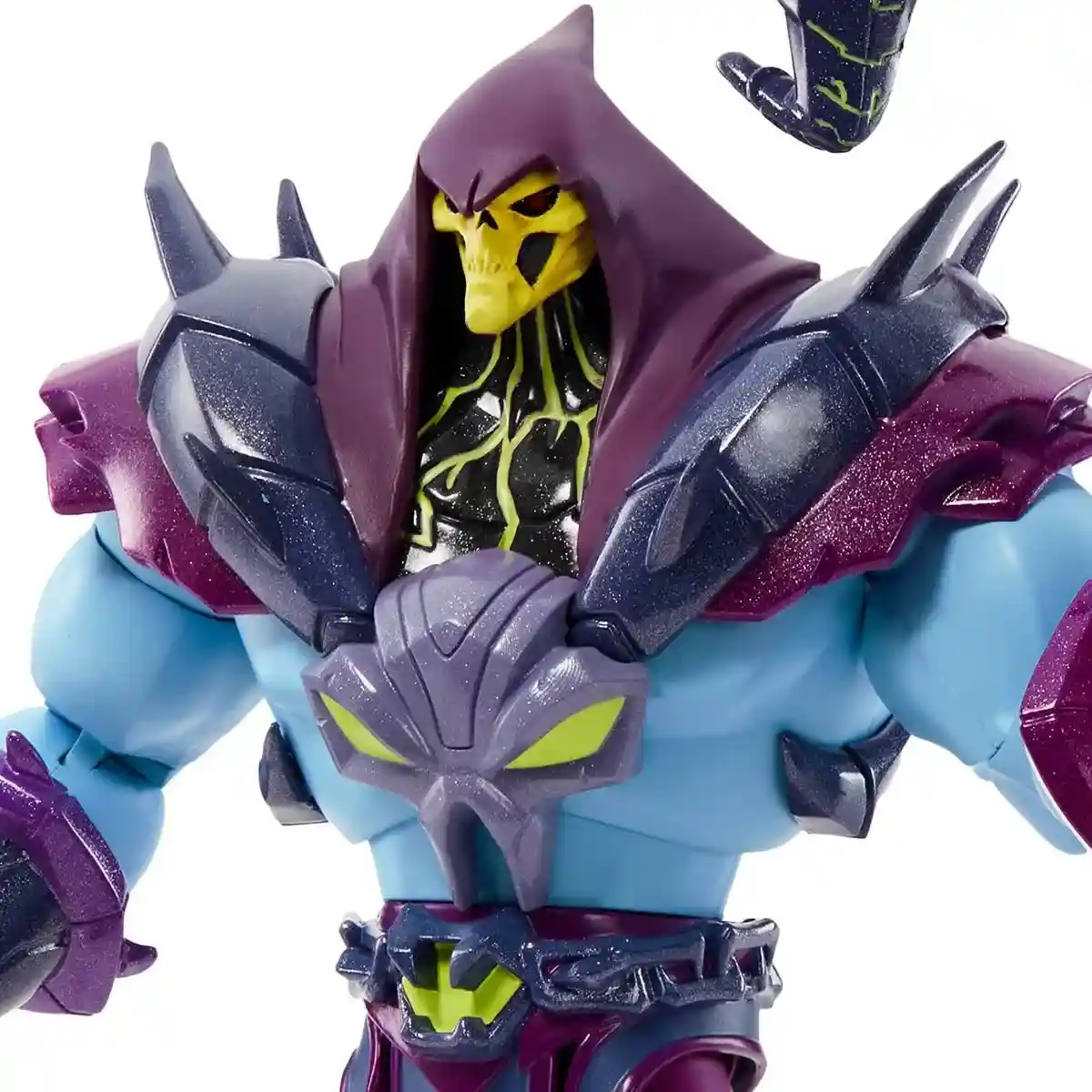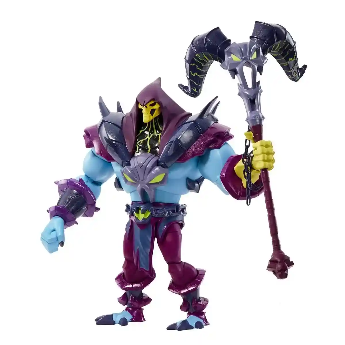 This Masterverse Netflix Animated Skeletor figure shows off a bulked-up, armored look with a deep purple hood framing his classic yellow skull face. His blue body is detailed with jagged purple armor pieces, glowing green accents, and a mix of asymmetrical limbs, including one yellow arm that adds to his menacing style. Packed with accessories, he comes with swappable hands and a massive Havoc Staff topped with a ram’s head, sculpted with sharp angles and eerie green highlights to match his updated design from the CGI series.