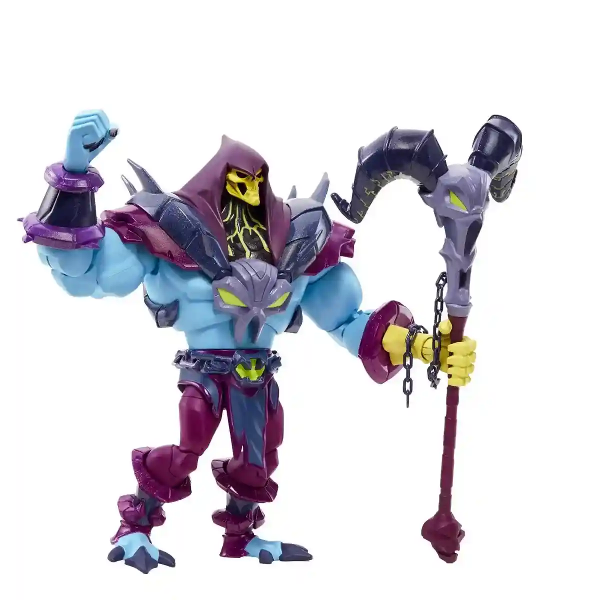 This is a 7″ line Mastervese branded Skeletor from the Netflix Animated Series He-Man and the Masters of the Universe. Much more articulated and detailed than the Mattel kids version, this Masterverse version of Skeletor Comes with complete with his Havoc staff that seems to be chained to his wrist! The paint applications on this version of Skeletor look amazing!