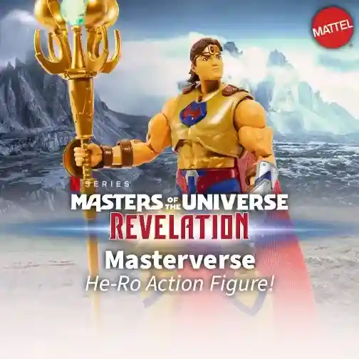 Revealed back in Mid March, 2022, Mattel unveiled a new He-Ro design and is under the Revelation sub line given he appeared in the Netflix series. According to Mattel, Revelation He-Ro carries a staff that opens to reveal a magic green gem! His face sculpt features a younger looking He-Ro than we’ve seen since he debut in the Masters of the Universe Classics line, with long flowing brown hair, a head band with a red jewel in the center, and an angular face design. He has silver and blue forearm bracers that appear to be removable but that remains to be seen! The waist piece reminds me of how they might pull off Roboto for Masterverse so we could see that same style coming down the line for more figures. The boots and shin armor match his gold chest armor, which features and H that resembles two arrows pointing away from each other. Finally, He-Ro’s staff has a basic visual design but can open up to reveal a green gem!