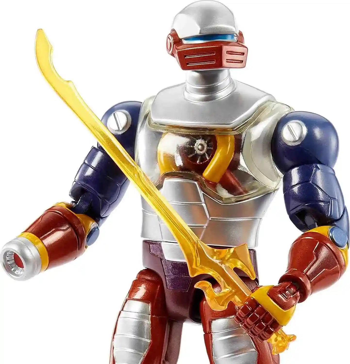 This package is typical of all the rest of the Masterverse figures, and dawns the Revelation logo at the bottom. Roboto is nicely displayed in his window packaging with the 2 red hot halves of the power sword next to his hands, as if he is ready to forge them back together, like he did in the animated series. Roboto includes 2 robotic arm attachments, and the aforementioned 2 red hot halves of the power sword. We also get a look at the amazing artwork which we will look at in full detail below.
