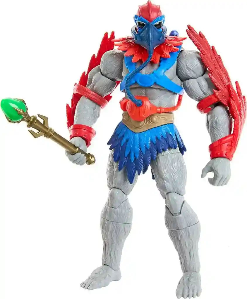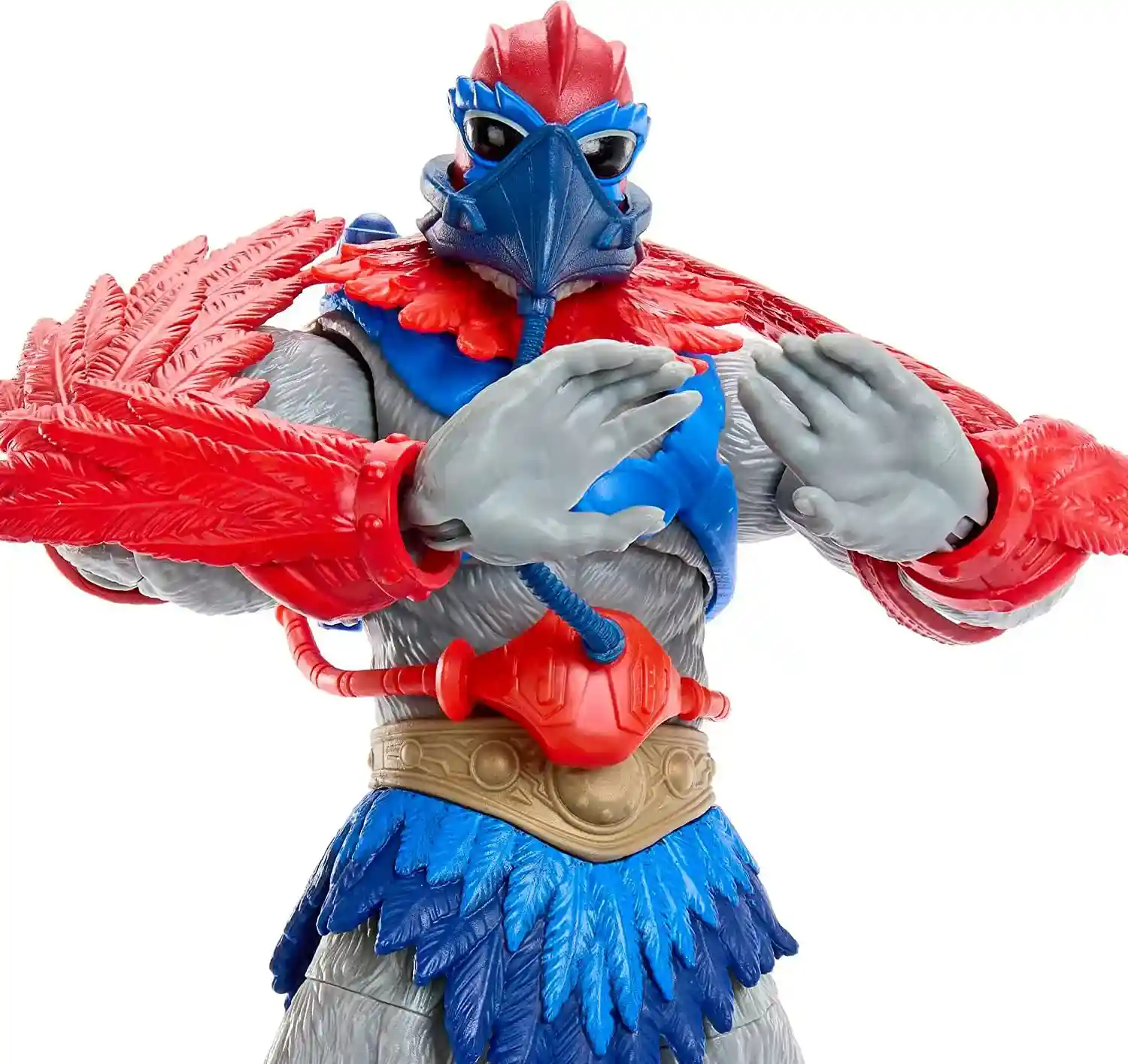 Revealed at San Diego Comic Con 2023, the New Eternia Masterverse Stratos will be hitting shelves in 2023 according Mattel’s MOTUesday announcement today. Mattel revealed the box design and pack out and, as you can see, he comes with all of the weapons and accessories that were displayed in Mattel’s booth!