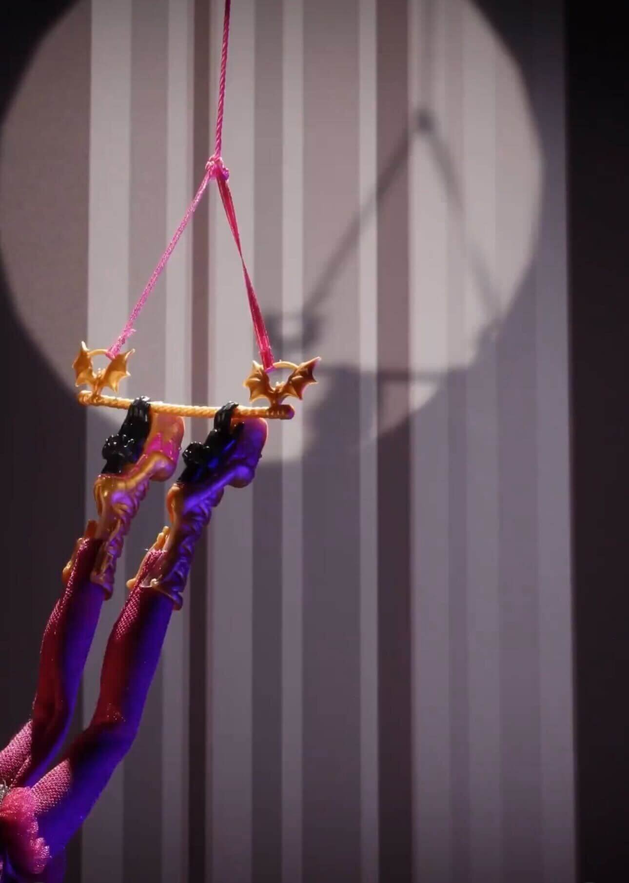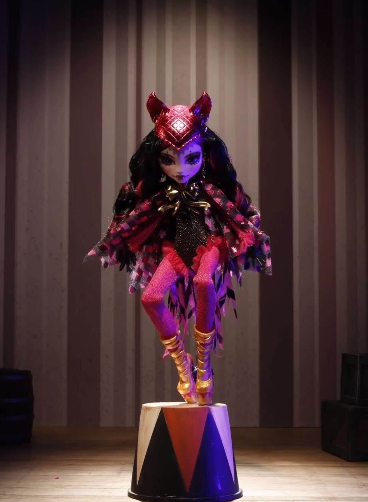 Draculaura makes her first appearance in this spooktacular circus as the Freak Du Chic returns. Our doll swings through the air in a captivating vampire-bat-inspired costume, with hair styled in boo-tiful curls.