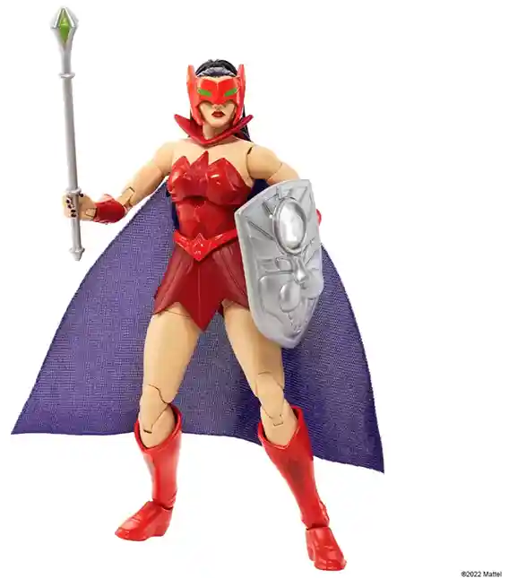 Today Mattel revealed it’s first Princess of Power sub-line character Catra! Catra is a power hungry member of the Evil Horde and is one of Hordak’s minions. Although initially specked out to be She Ra’s main nemesis, the Filmation crew decided to go in a different direction. It’s a mystery where her loyalties lay as in one episode she joins Skeletor to annihilate Hordak to become the Queen of the Magicats. She doesn’t really get along well with others as she often has her own wishes to overthrow Hordak and she does not play nicely with her other female characters in the cartoon, namely Scorpia. Catra comes adorned with her signature cat mask, silver cat faced shield, staff and purple soft goods cape! She looks absolutely beautiful and I am very excited to get our first PoP Masterverse character!