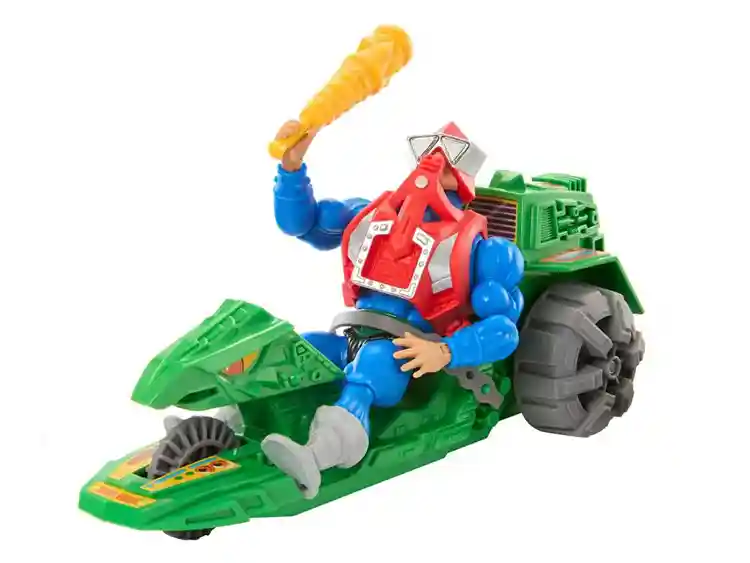 We can see that the box features an homage to the vintage design with Mekaneck (instead of He-Man) tearing away from Castle Grayskull! This set comes with the Ground Ripper (back in the day it was called the Road Ripper) with an alternate head for the vehicle and Mekaneck with a neck extension piece and his famous yellow mace. This version of Mekaneck does not have his twisting, telescoping action feature so think of this figure as an homage to the MOTU Classics design where they gave him two neck pieces.