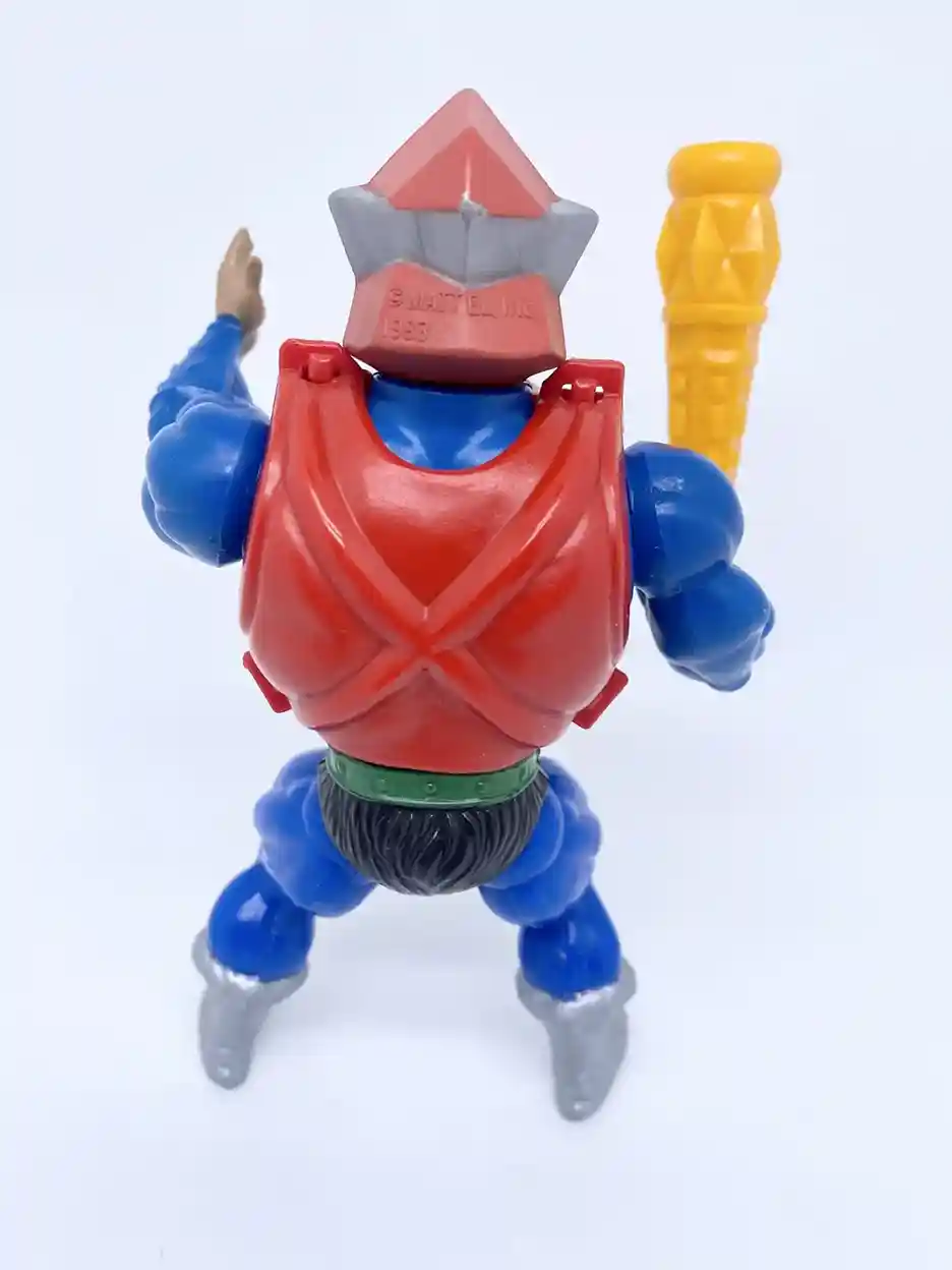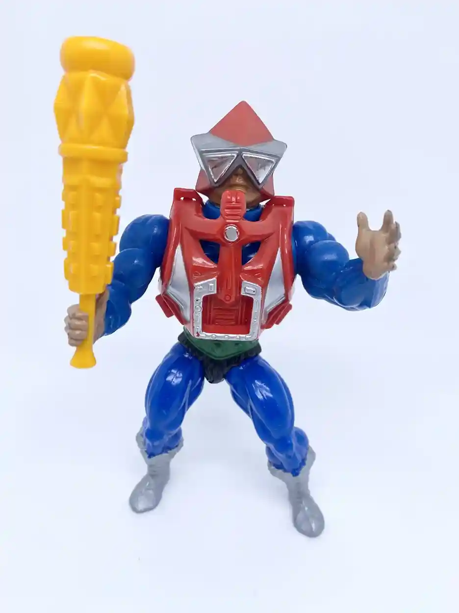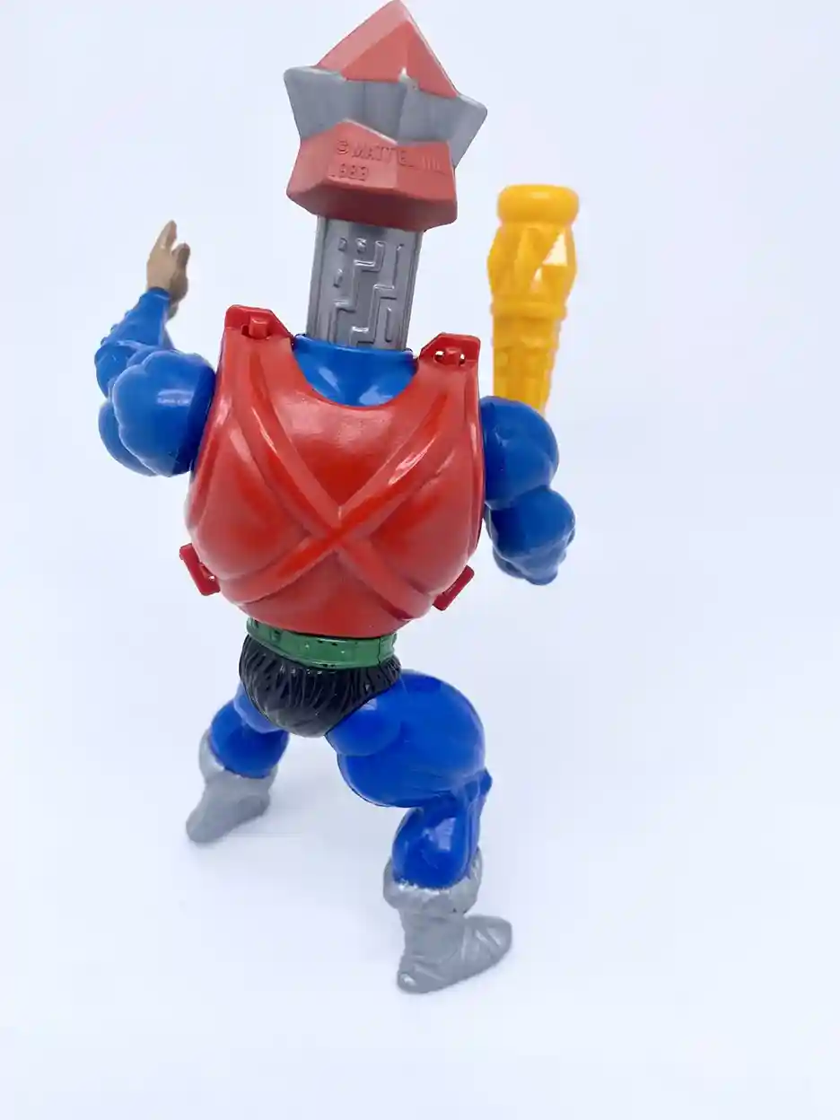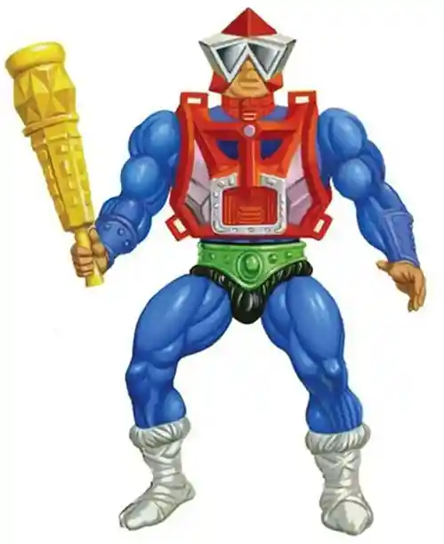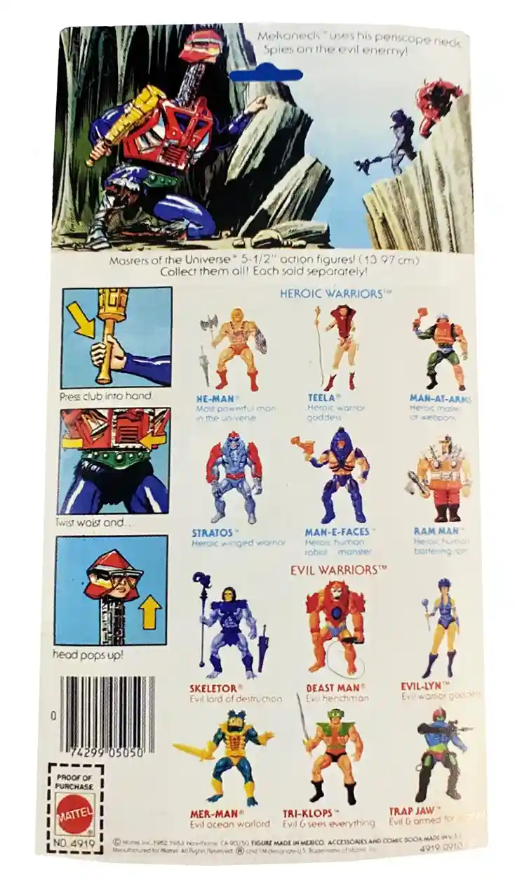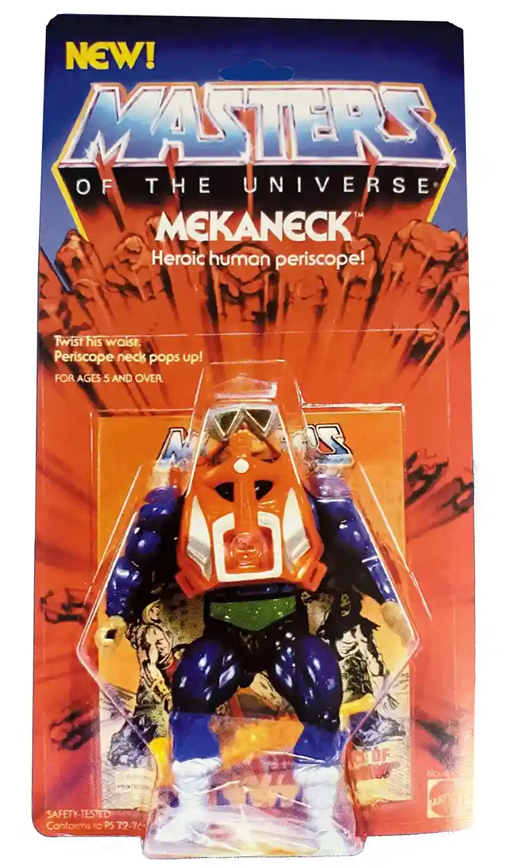 Mekaneck was released by Mattel in 1984. Member of the Heroic Warriors, Mekaneck had the power of long-range viewing. He was nicknamed the Heroic Spy and had a working title of Spy Man. Mekaneck had a periscopic neck that would pop up from his torso when twisting his waist. His body was a reuse of the He-Man buck, including blue arms, blue torso and blue legs with silver boots. But his torso had to be modified to allow his periscopic neck to fit inside. He had a unique body armor that was then used for Stinkor, and a yellow battle club.