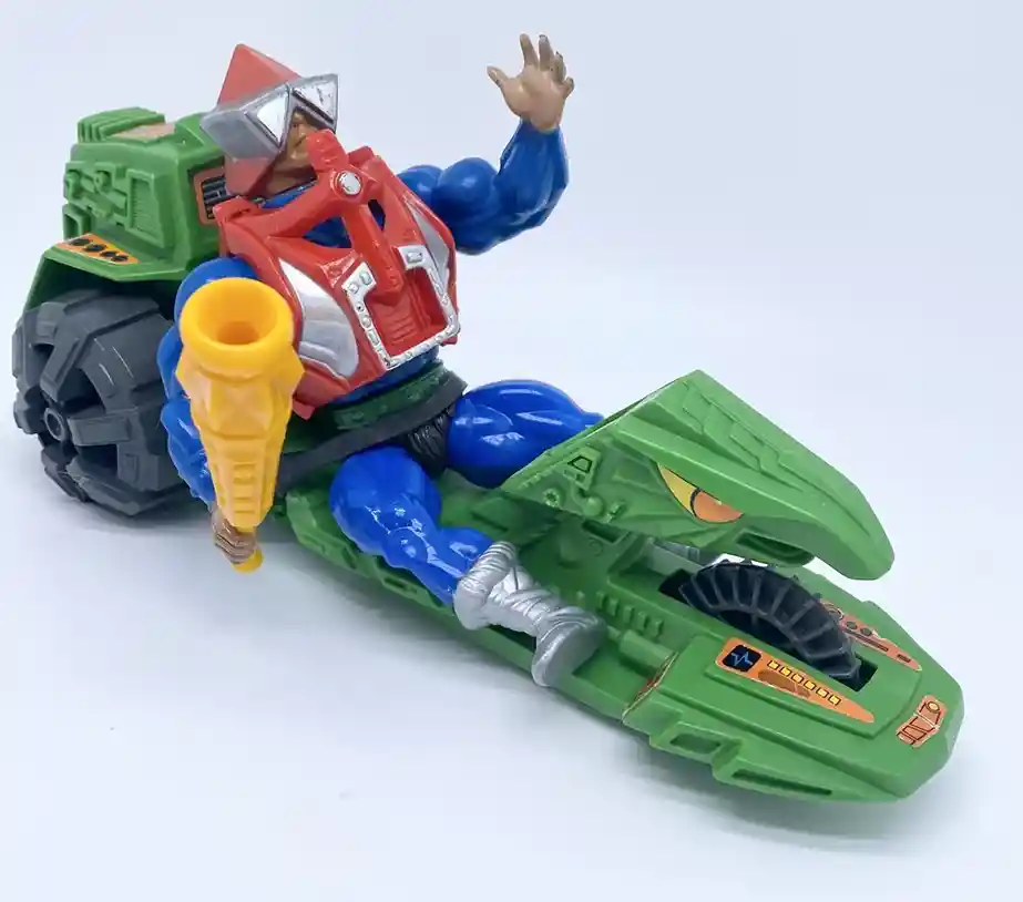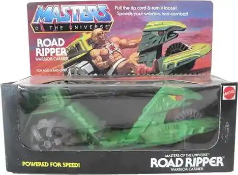 Released in 1984, the Road Ripper was a 3 wheeled motorcycle with a bright green dragon themed design that carried one character who would strap in with a seat belt. It came with a red rip cord, when inserted into the rear and pulled out quickly would send the Road Ripper speeding across the floor!