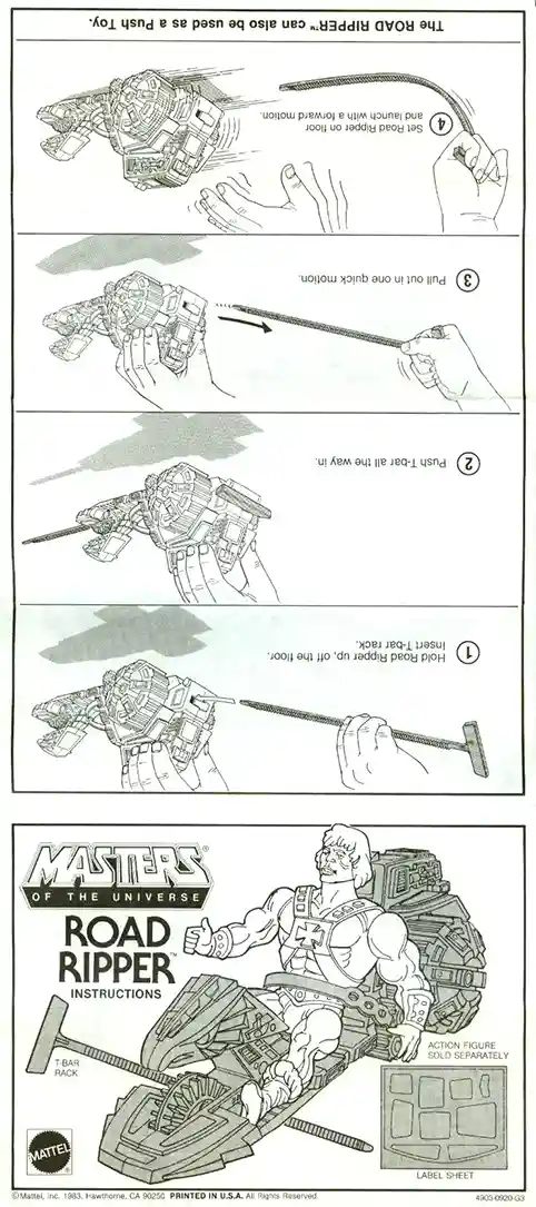 The Road Ripper was a vehicle released in 1984. It was a vehicle belonging to the heroes and was meant to transport a warrior quickly. The road ripper had no offensive weapons. Although the toy sold well and was repackaged with He-Man, it was never featured much in the various media. It makes a brief appearance in the He-Man and the Masters of the Universe episode “The Energy Beast,” where Orko is snooping around in Man-At-Arms‘ lab and finds its prototype and then proceeds to try it out, only to crash it in King Randor‘s throne room. The vehicle pops up again in the episode “The Time Wheel,” where Prince Adam/He-Man and Orko use it as their transport to and from the desert. It is never referred to by name in either episode.