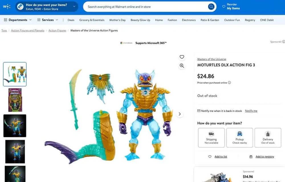 We wanted to give a huge shoutout to Joe for the heads up and Mr. Home Arcade for cracking the code on how to find the Walmart Deluxe exclusive Mutated Mer-Man on Walmart. Mer-Man is only available by region right now and the link to the listing is geofenced and the actual product page will only scan up if you live in certain areas of the United States. If you are in a zip code that does not have Mutated Mer-Man in stock, you will get a page not found error but bookmark the listing as it will scan up when the figure is in stock at your local store.
