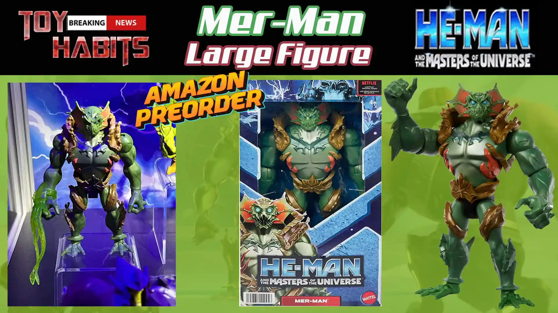 The large format Mer-Man figure has hit Amazon and is up for preorder with a release date of November 1, 2022. This is the first in package shot we’ve seen of this figure, although we did see his mini me version on display at SDCC 2022. Clad in greens and golds, this Mer-Man will fit nicely into your Netflix animated He-Man figure collection!