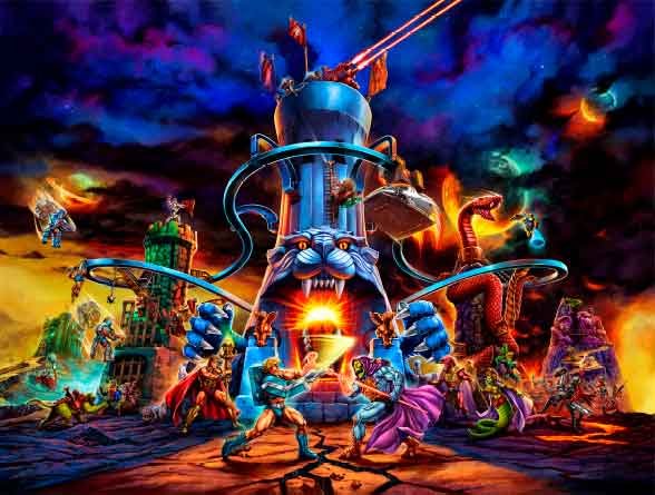 There are so many easter eggs hidden in this artwork, where do we begin? According to the information we received from Mattel ” The packaging features original art by Axel Giménez and Francisco Etchart. Their drawings were influenced by the “vintage” Eternia box art by William George.” Also they mentioned that “Look closely to find “Easter Eggs” throughout the artwork. Fan favorites from heroic and evil warriors to the ‘Powers of Grayskull’ are featured.” Ok folks, you heard it hear first, Mattel hinted at the POWERS OF GRAYSKULL!!! And if you don’t believe it, take a look at the incredible art work reveal.