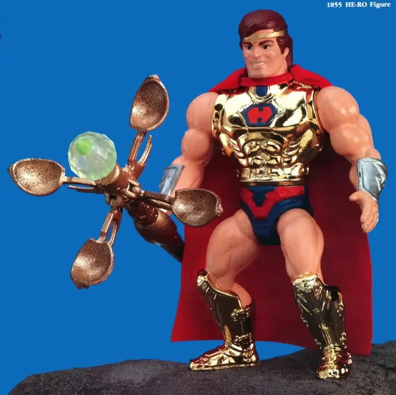 He-Ro was planned to be a new character introduction, the centerpiece of The Powers of Grayskull, a spin-off line of Mattel‘s Masters of the Universe toy line in 1987. The Powers of Grayskull was to be set in Eternia’s prehistoric past, called “Preternia” to differentiate, and promised to reveal secrets about the source of He-Man’s power, through the adventures of He-Ro, a young but powerful wizard who lived in that time.