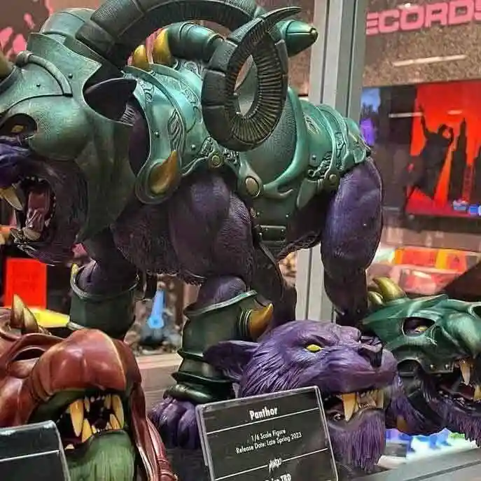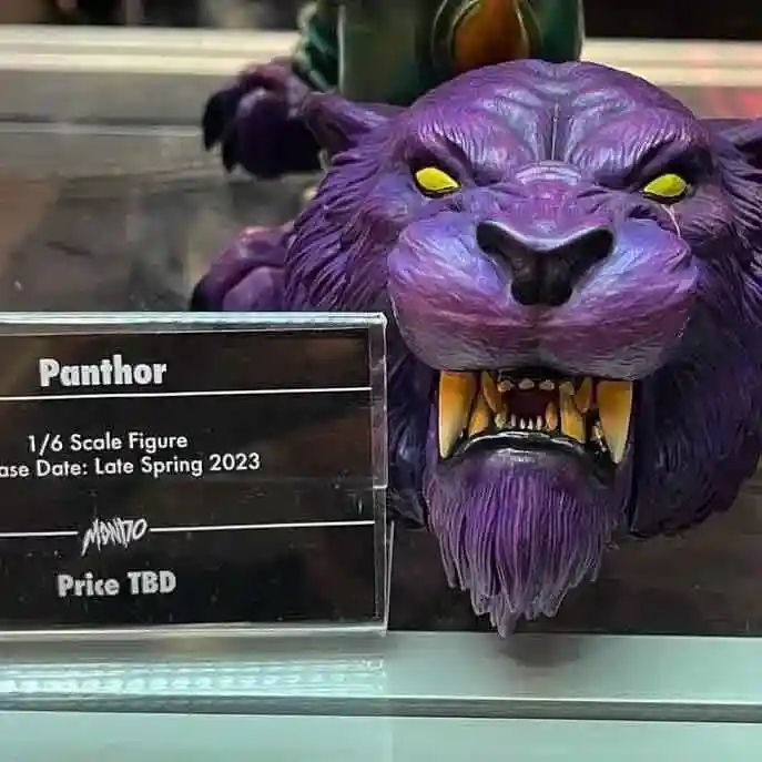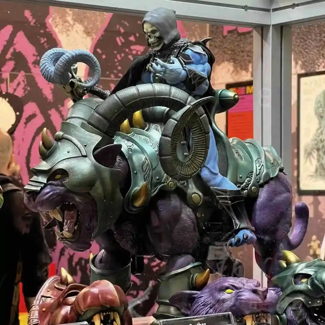 Mondo revealed their deluxe Panthor in all of his mighty glory and this prototype looks outstanding! Who is that riding atop Panthor? It is none other than a brand new sculpt of Skeletor and from what we are seeing from the booth and the concept art, this pair will be making the most killer duo to add to your Mondo shelf! Skeletor is clad in a nice black armor complete with a black hood, which will give him a differentiated look versus previous versions of the Evil Lord of Destruction. Looking at the concept render, it appears he will also come with interchangeable battle armor and real furry shorts, like the deluxe Mondo He-Man that went up for preorder earlier this year and the Anti Eternia He-Man that was also revealed today .