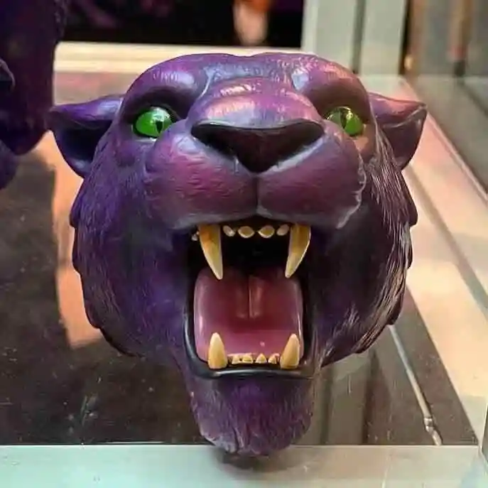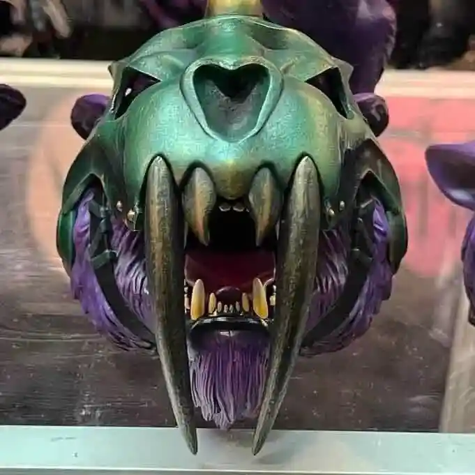 Panthor is clad in his classic green armor with a rams horn helmet very reminiscent of the MOTU Classics design! The saddle looks to have a leathery texture to it and has some very ornate detailing. The prototype captured the deep purple we all know and love from Skelly’s naughty kitty!
