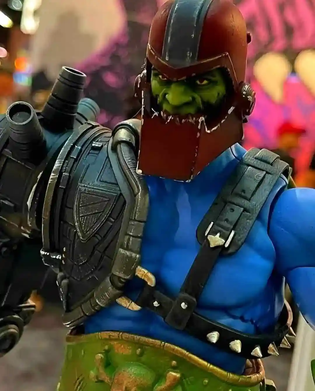 The prototype for Trap Jaw is looking amazing and so life like! His face looks battle hardened and worn and his mechanical arm looks like it is made of metal. You can also see a lot of weathering on the paint app and some wires coming out from the back of the attachment, which add some realism to the design.