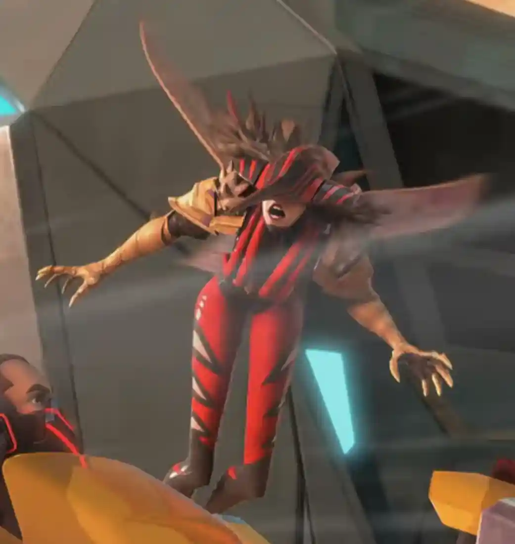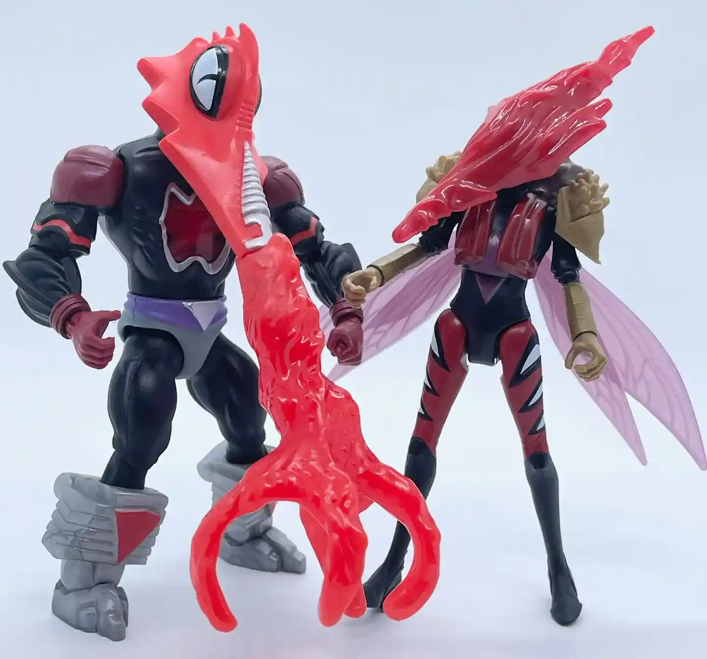 Mo’squita’ra has a delicate yet graceful body with two sets of lavender wings on her back. She has a metallic red helmet shaped like a mosquito’s proboscis. She is clad in a black suit with a brown fur-collar that extends all the way to her lower back. Mo’squita’ra is based off the male Mosquitor and the first female of the race. In fact, only the female mosquitos suck blood so maybe they were trying to correct that! Like Ram Ma’am, she is the second character to take on a role that is opposite of the original gender from the 1980’s.