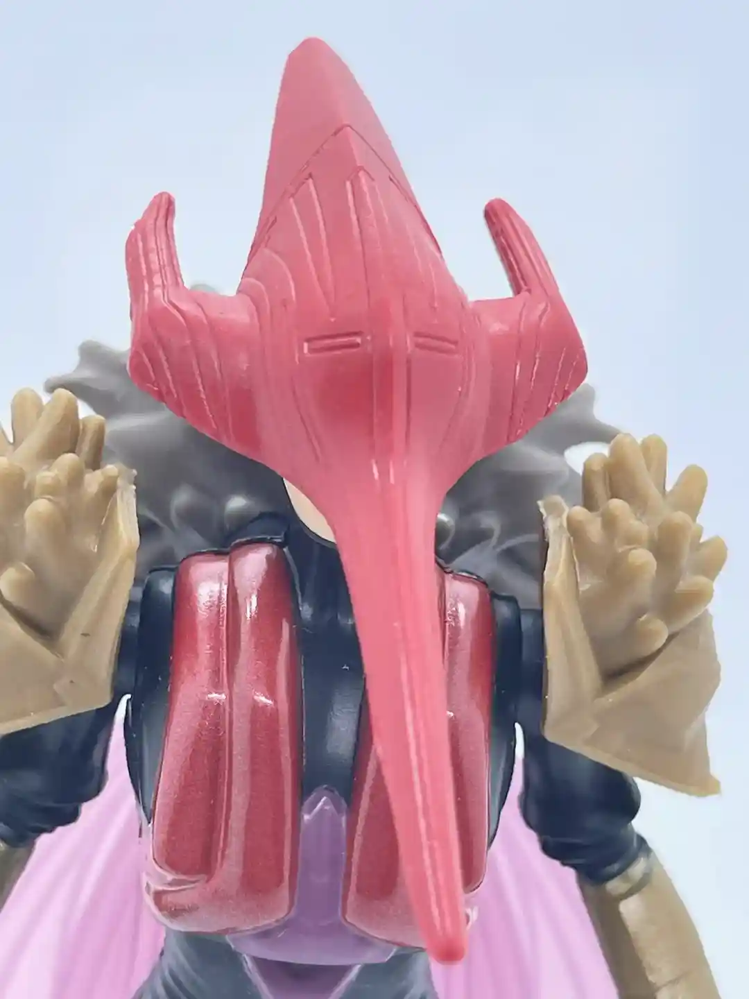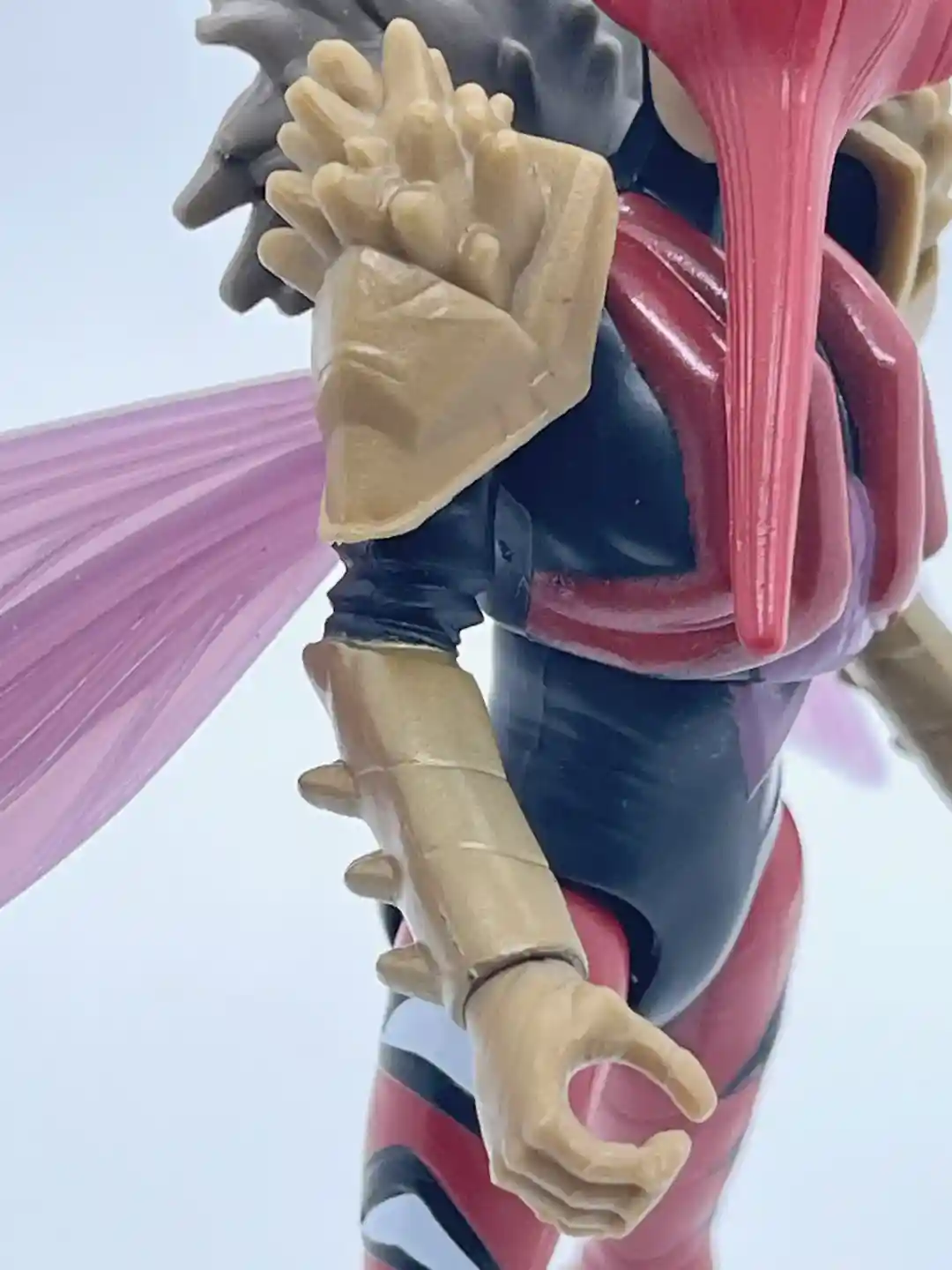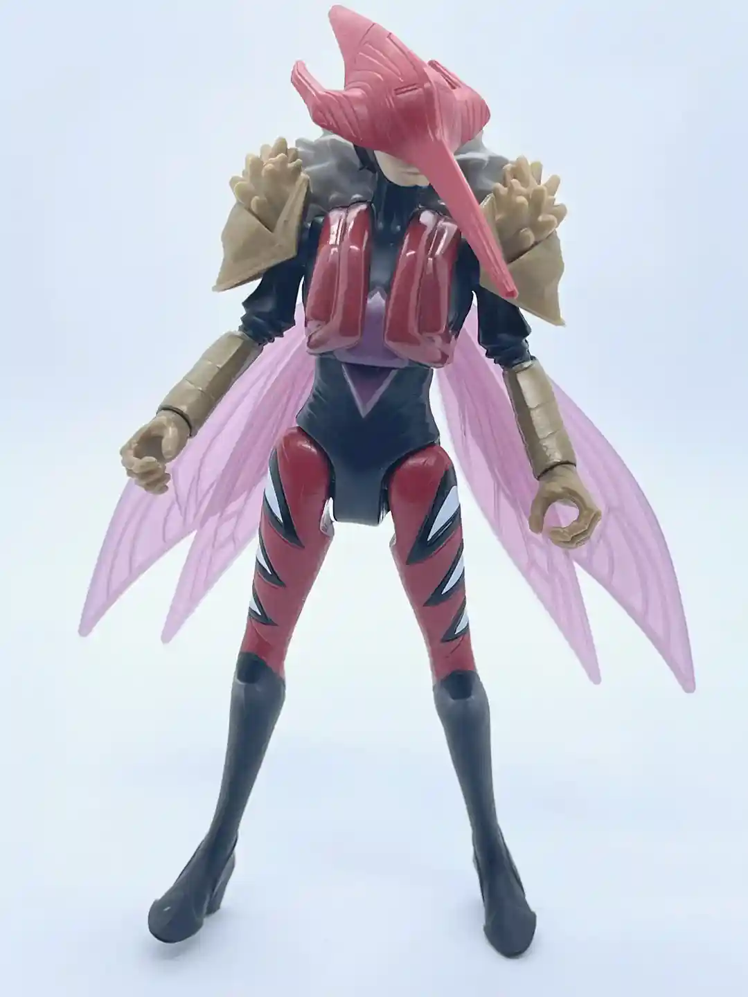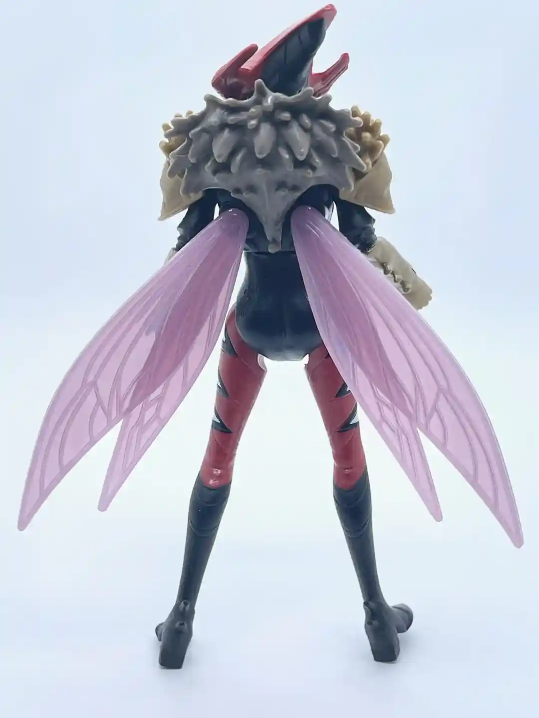 Her head has a half humanoid and half mosquito look to it as the sculpt is shaped like the head of the insect she is modeled after. Her helmet is cast in a semi-metallic, crimson red that has some defining lines to it, which add to its depth and dimension. She also has two little slits for her eyes, which makes the mask come alive. It almost has an earthy, woody look to it as the lines follow a pattern of wood grain. Part of the helmet around her ears flares back on both sides as it comes to a crest at the top of her head. On the back of her head under the mask, her head also comes to a point and has some extra sculpted detail, which was a surprise. The long mosquito nose completes the look and also pays homage to the original Mosquitor from the vintage line. It also looks like she has a black balaclava around her face, which gives her a rather mysterious look.