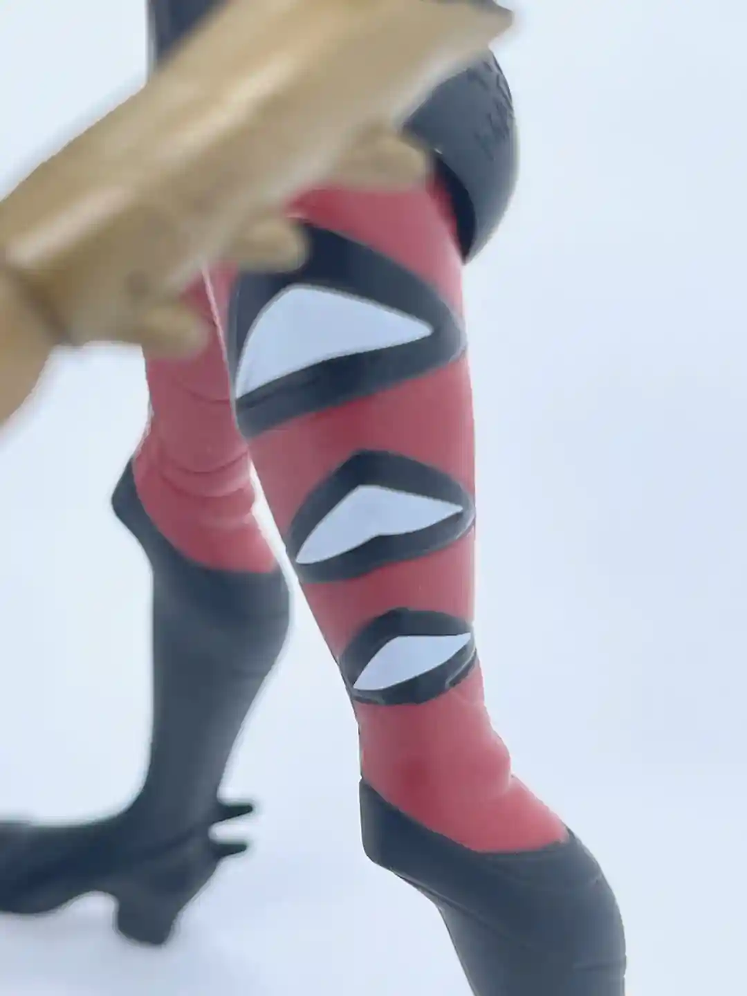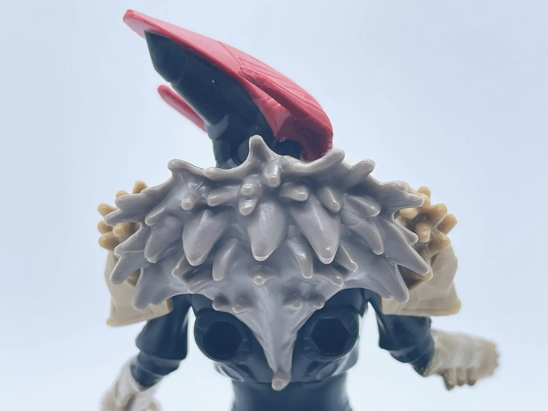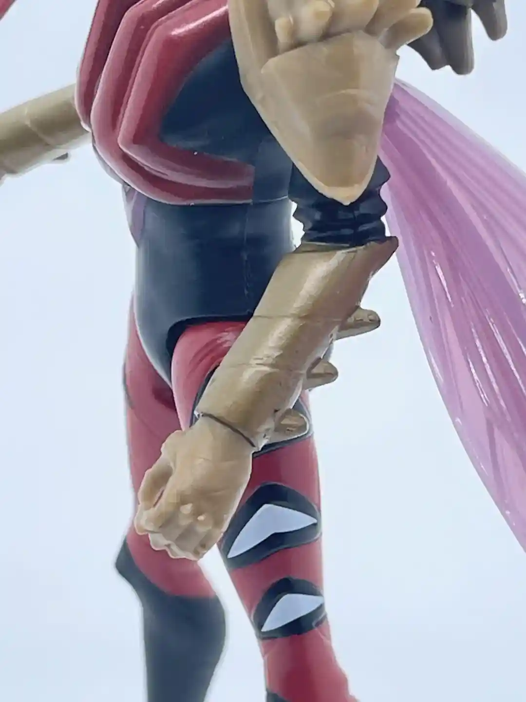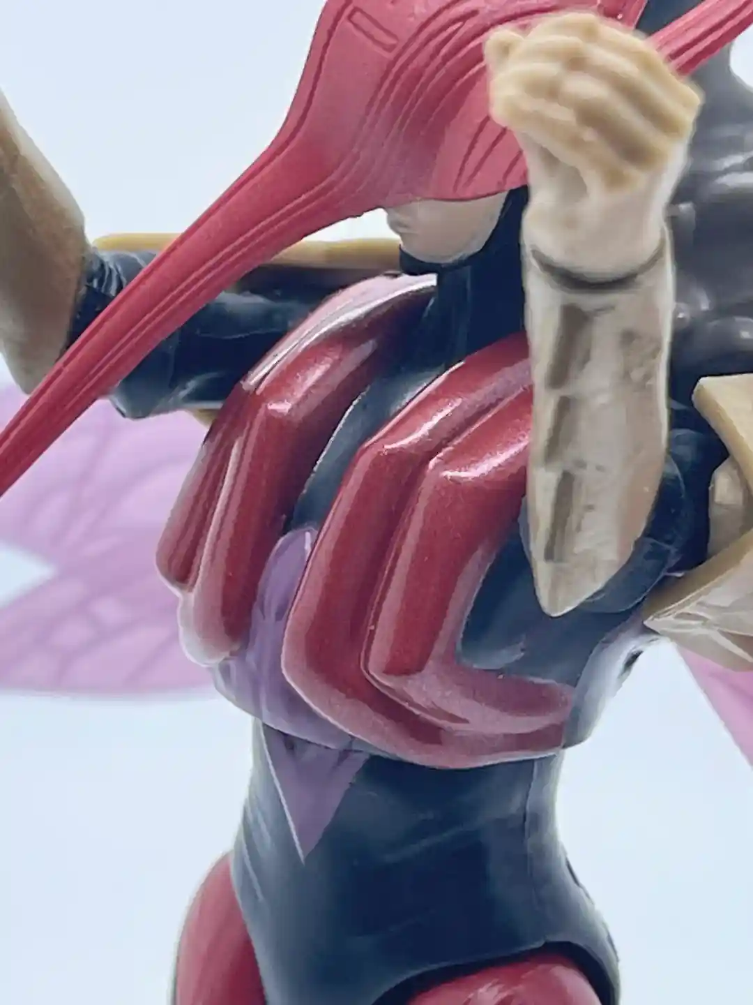 Her head has a half humanoid and half mosquito look to it as the sculpt is shaped like the head of the insect she is modeled after. Her helmet is cast in a semi-metallic, crimson red that has some defining lines to it, which add to its depth and dimension. She also has two little slits for her eyes, which makes the mask come alive. It almost has an earthy, woody look to it as the lines follow a pattern of wood grain. Part of the helmet around her ears flares back on both sides as it comes to a crest at the top of her head. On the back of her head under the mask, her head also comes to a point and has some extra sculpted detail, which was a surprise. The long mosquito nose completes the look and also pays homage to the original Mosquitor from the vintage line. It also looks like she has a black balaclava around her face, which gives her a rather mysterious look.