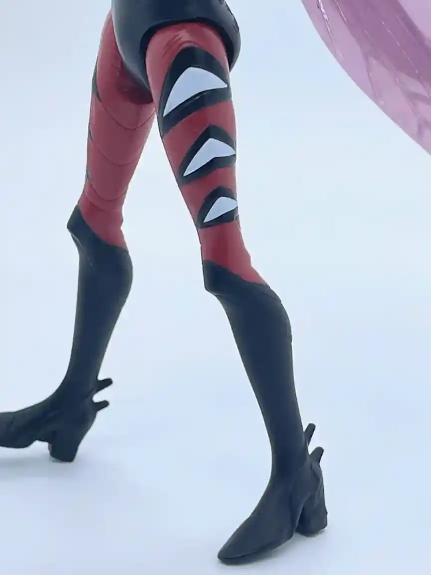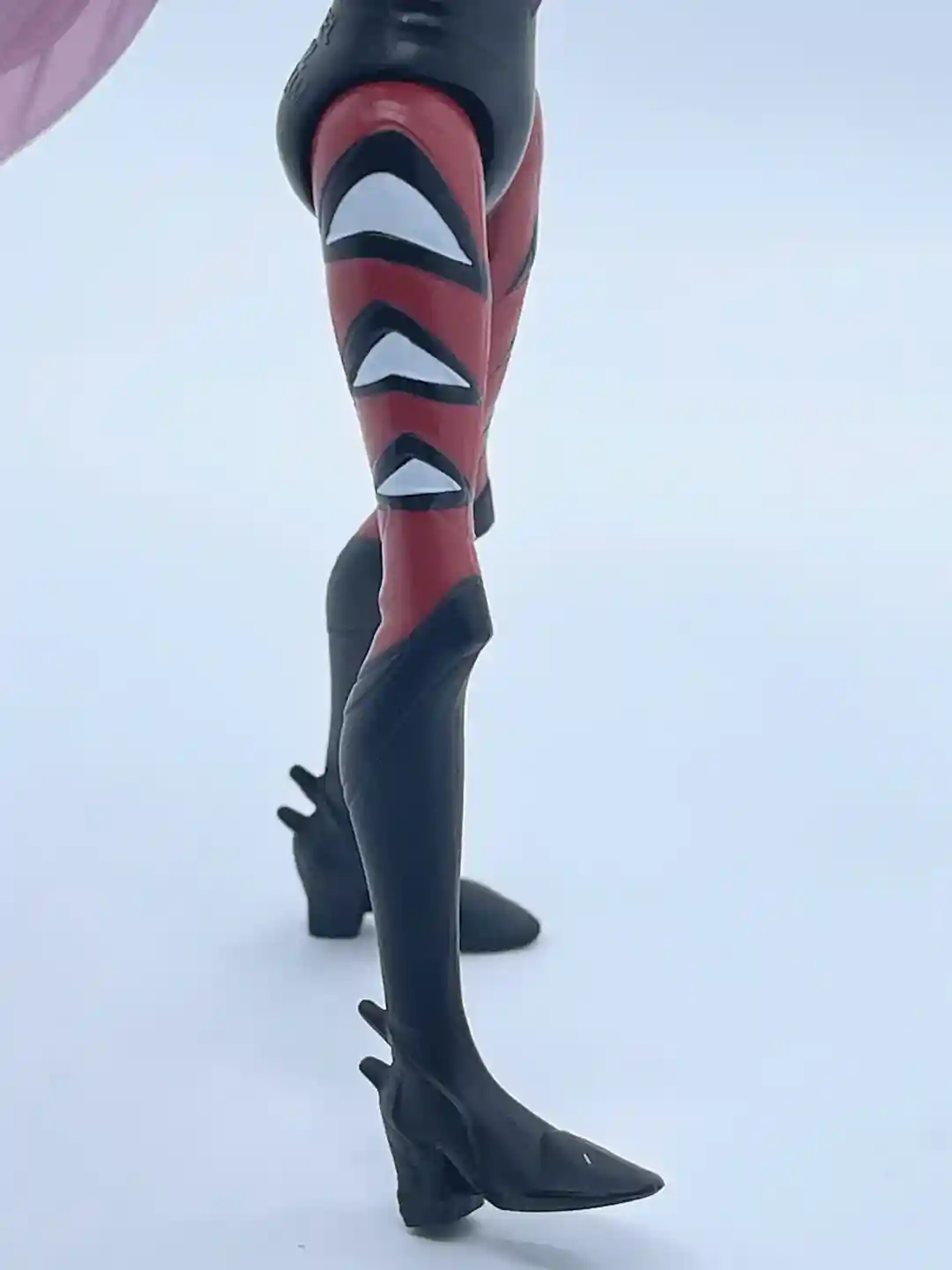 She is wearing heeled shoes that run all the way to her knees. The shoe design has a couple spiked parts that are coming out of the back of the boot, which gives her a more intersting look all around. The black and white markings on the sides of her legs also pay homage to the vintage MOTU Mosquitor as his eyes were painted in a similar fashion. The only gripe we have with the boot and leg design is she is extremely difficult to stand up (and keep standing) but the holes on the bottom of her feet allow for a figure stand and the NECA figure stands fit the bill!