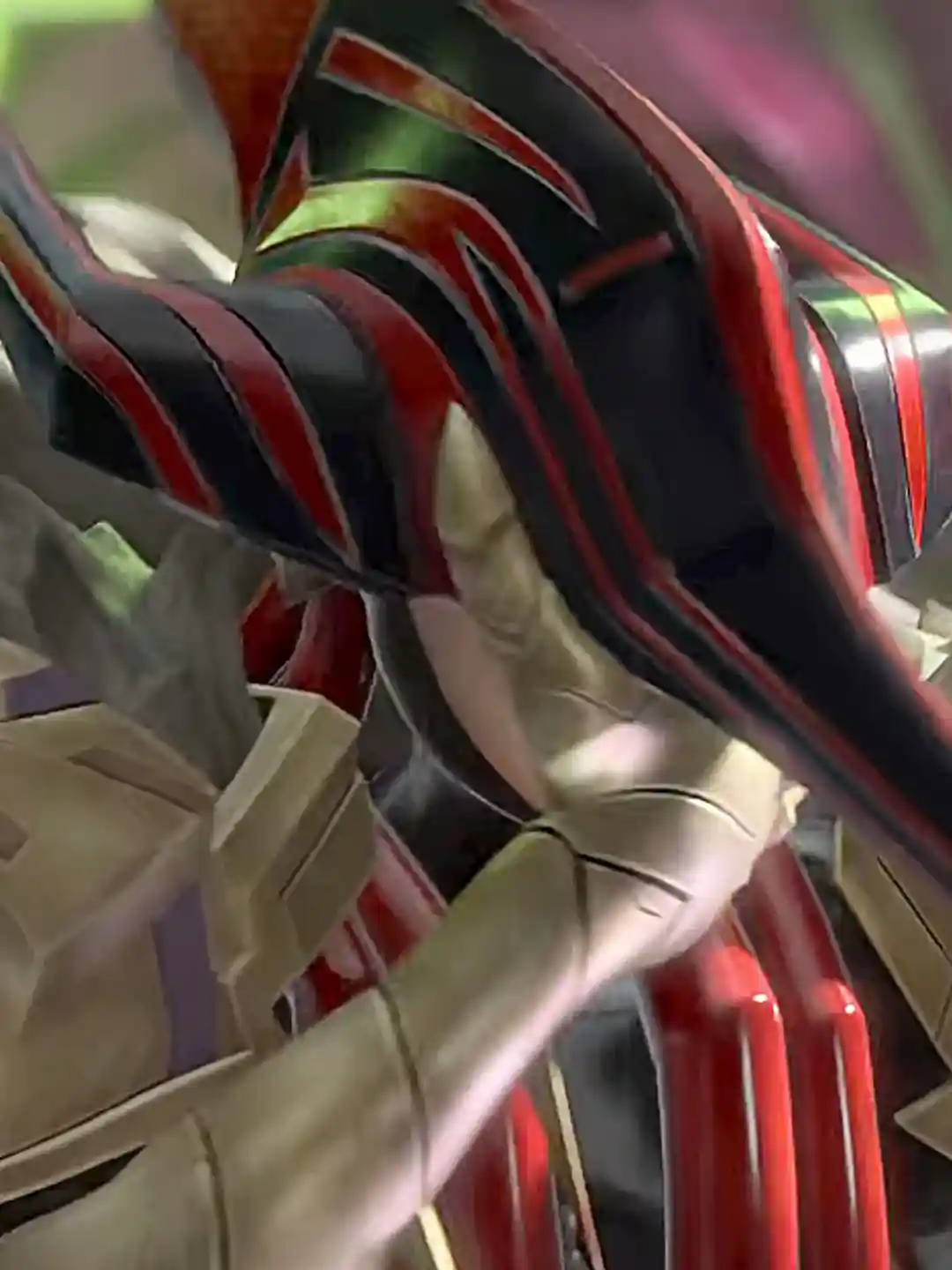 For her outfit, she is wearing a black and purple leotard’esque piece of clothing with black-red striped leggings Her arms have gold pauldrons that appear to have a furry material and texture to them. Her forearms have spiked gauntlets that extend all the way to her elbows. She is also wearing gold gloves that have some nice texture to them.