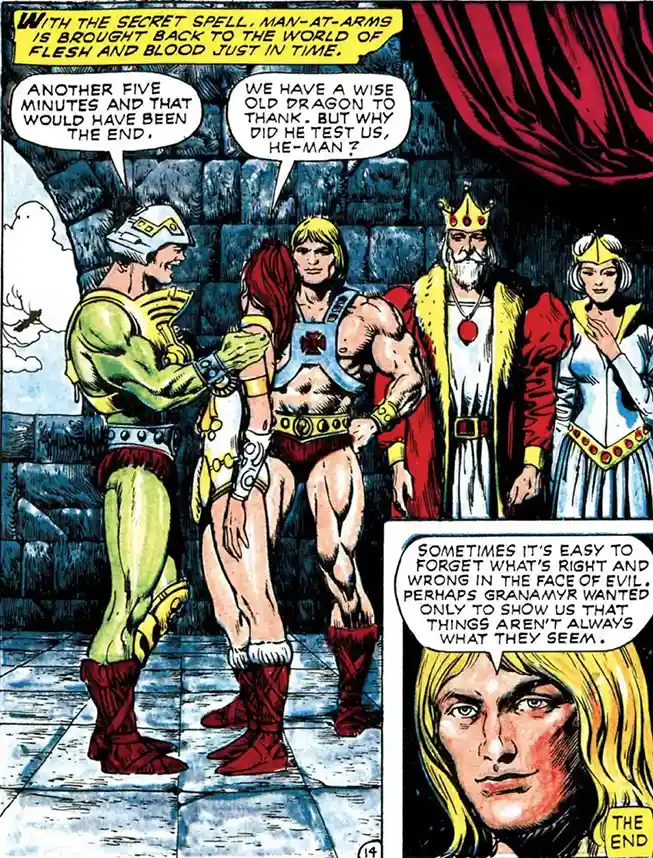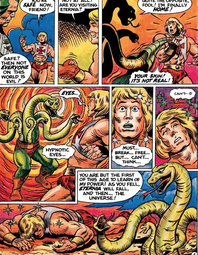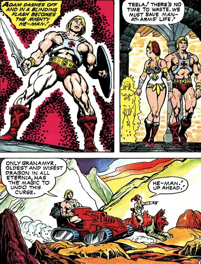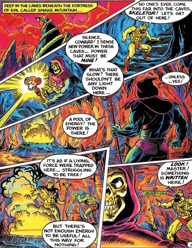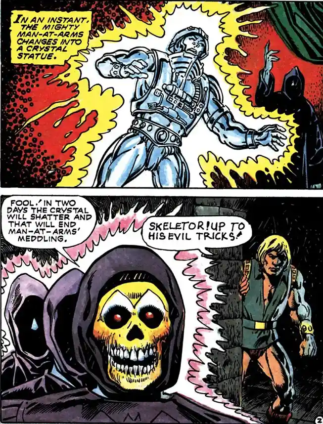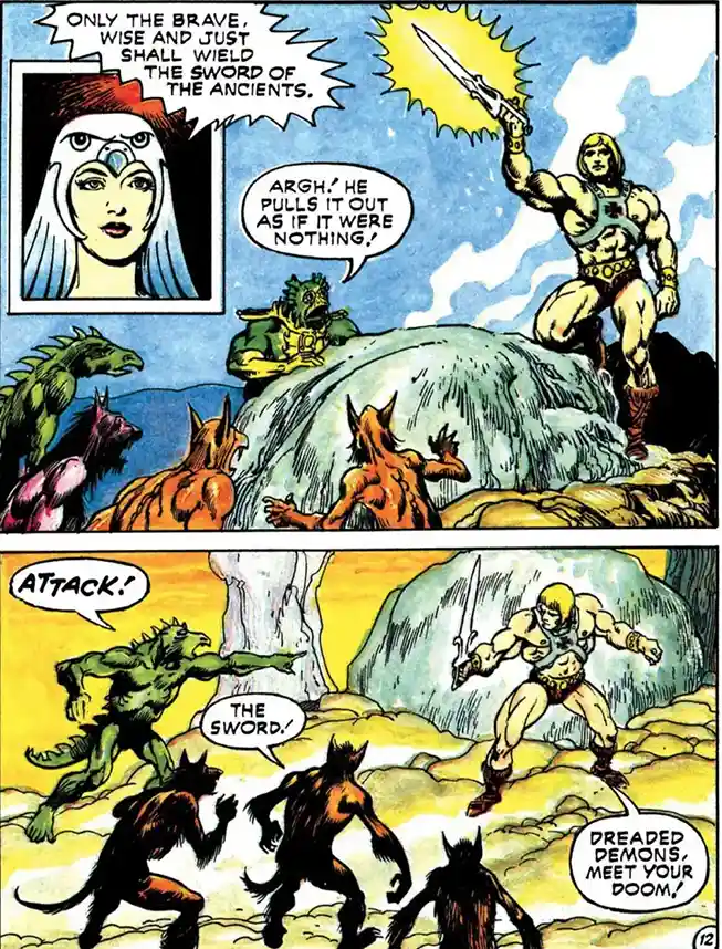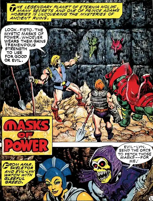 In the mini comic “The Masks of Power”, He-Man and Fisto fight against the evil forces of Skeletor when he unleashes two beasts that emerge from the mystic Masks of Power. He-Man can be seen transforming from the quite Prince Adam (in his Blue Vested mini comic version) into the powerful He-Man by uttering those 5 magic words ” By the power of Grayskull!” The Sorceress makes a came appearance in this issue asking He-Man to recover the Sword of the Ancients to send back the evil beasts that Skeletor unleased. All of Skeletor’s main minions; Trap Jaw, Mer-Man, Beastman and Evil Lyn also make an appearance in this issue! We even get to see Mer-Man battle it out with He-Man sending in his giant red octopus! In the end, He-Man recovers the Sword of the Ancients and defeats the evil demons.