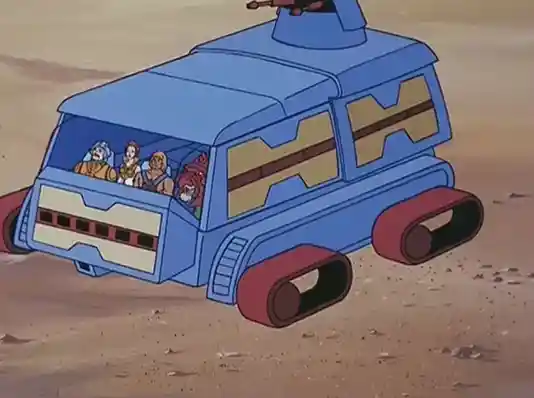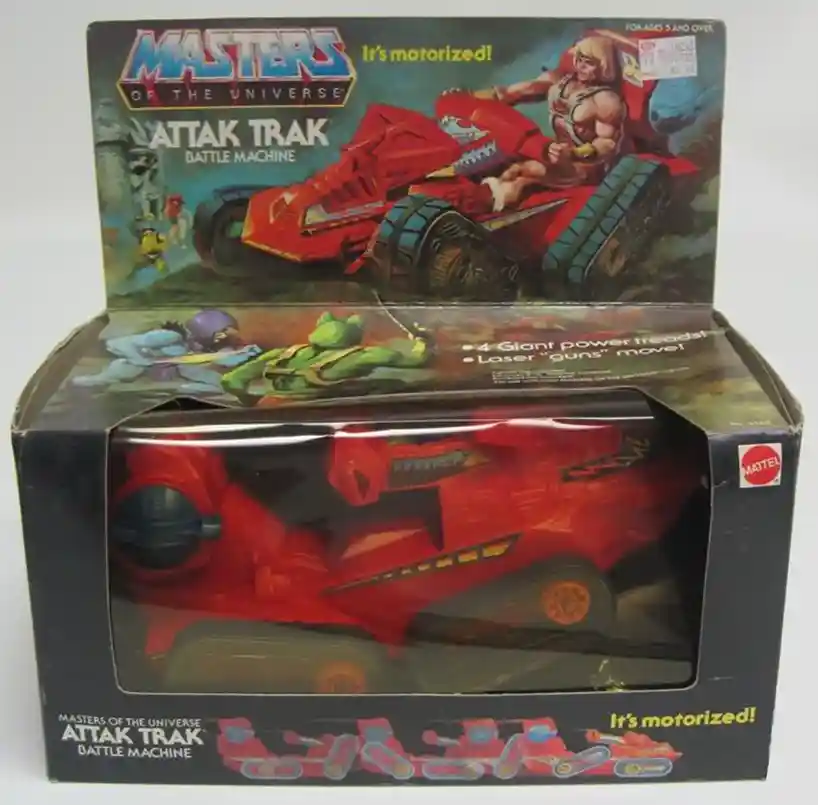 The Attak Trak has been featured in the Masters of the Universe cartoons many times. Although it looked different that it’s toy version in the Filmation cartoon, that Attak Trak was a character all it’s own as it spoke and respond to He-Man and the gang in it’s robotic voice! Released in 1983, Mattel’s battery powered motorized version of the Attak Trak did not resemble the one in the cartoon. This version of the Attak Trak featured similar motorized tank treads to that of the cartoon, but that is where the similarities ended. It held only 1 figure that was strapped down with it’s rubber band like seat belt and was a bright red color and beautifu blue accented stickers! Featured in many famous Masters of the Universe Art posters, that Attak Trak is was beautiful illustrated making it a very popular vehicle! It is one of my personal favorites, (pictured below) as I still own a fully functional working version! I just love watching those treads spin around and making that thing run across the room with He-Man strapped in the seat!