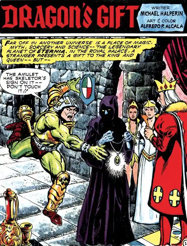In the mini comic ” The Dragon’s Gift”, a stranger appears at the Eternian Royal palace with a magic Amulet that ends up turning Man-At-Arms into a Crystal Statue. He-Man takes the Attak Trak to see Granamyr to help undo this evil spell that has been cast upon Man-At- Arms. They are asked to unroot and bring back the Sky Tree, but in the end He-Man is unwilling to take the Sky Tree’s life to save another life. In the end being tested by the mighty dragon Granamyr, He-Man shows great mercy and wisdom and is granted the spell he needs to free Man At Arms from his crystal prison. This issue features Skeletor in Disguise, an eldery mini comic version of King Randor and Queen Marlena, and the Attak Trak makes a cameo as well! All of these versions of these characters have yet to be made into the Origins line! So if Axel Gimenez is using this mini-comic for Card Back art inspiration, then that is very exciting news!