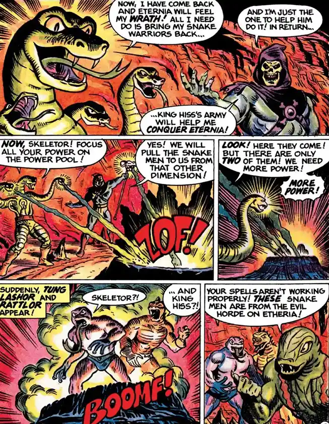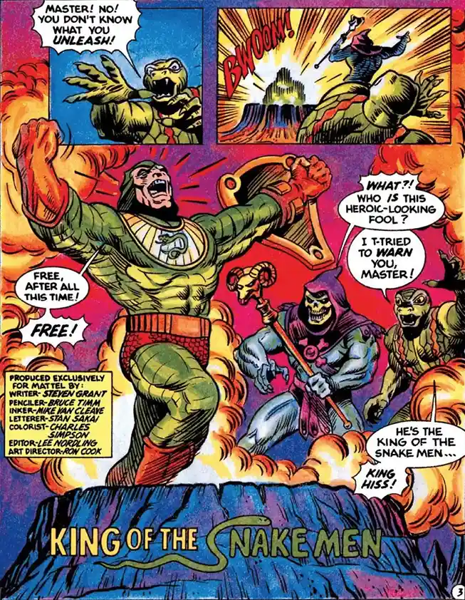 In the mini-comic, King of the Snake Men, Kobra Khan is featured in the issue accompanying Skeletor into the depths of Snake Mountain when they come across an energy source that unleashes King of the Snake Men, King Hiss. Then thru that same energy pool unleashes Tung Lashor and Rattlor as well! Well, it does not seem like coincidence that we received leaks from our friends at CANAL DOS ROSMINEIROS that these Snake Men are coming to MOTU Origins in 2023! So again, it seems fitting that Axel Gimenez was using this comic as inspiration for his upcoming MOTU Origins Card Art!