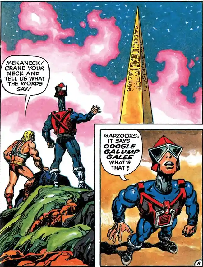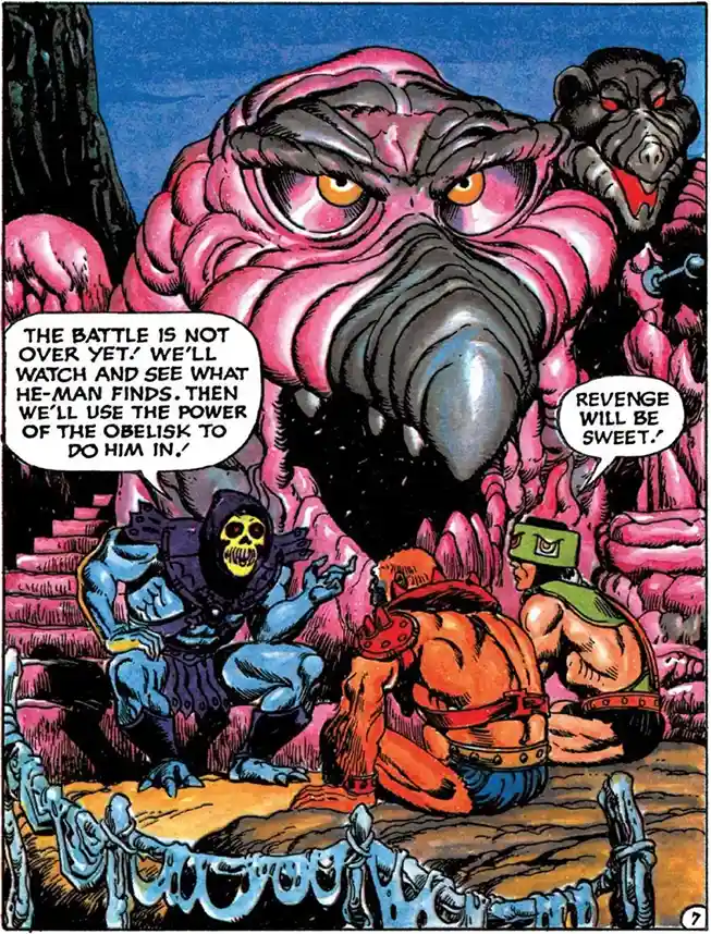 Once a year, the great Obelisk rises from the ground and it’s powers and meaning are always different. In the mini comic the Obelisk, He-Man, Teela and Buzz-Off fight off Skeletor and his Henchmen when the great Obelisk rises and they fight to decipher it’s meaning. We also see a cameo of Mattel’s version of Snake Mountain make an appearance in this issue as Skeletor and his henchmen hide out.. Mekaneck helps He-Man read the words carved on it’s top and the Sorceress translates that this is a prophecy of things to come and says that the Obelisk contains both good and evil powers by uttering either ” Powers to Good” or “Power to Evil”. Skeletor over hears this and in a fight to the end, both good and evil creatures emerge. Then as He-Man and Skeletor utter words at the same time, the Obelisk begins to crumble. We have covered both Mekaneck in the leak article Mekaneck & Road Ripper Coming to MOTU Origins in 2023!, and Snake Mountain as a possible release in our special 3 part series What MOTU Vehicles and Playsets are Next in the Origins Line?. Let’s take a closer look at each below.
