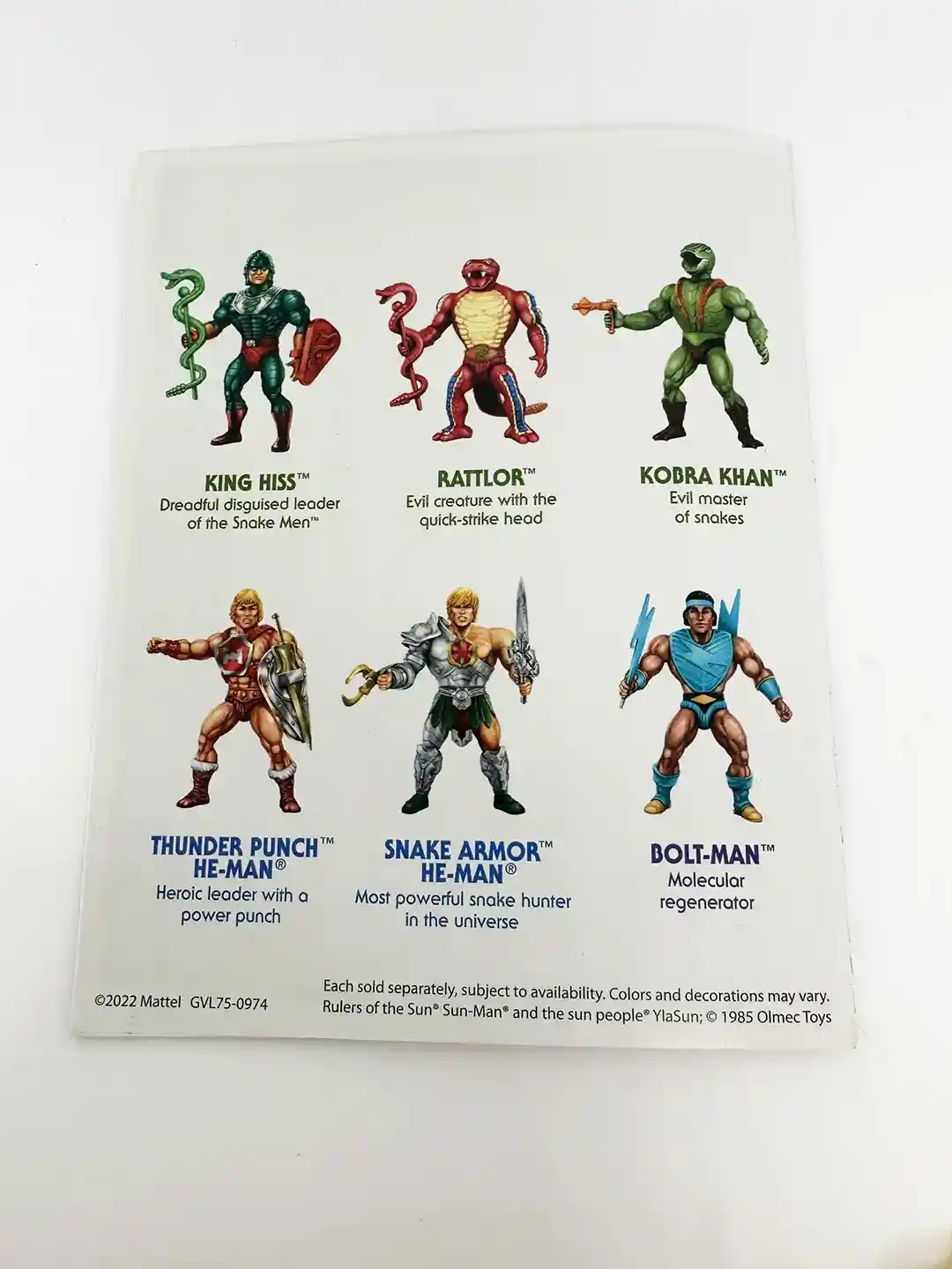 With spectacular artwork by Axel Giménez & FETCH Francisco Etchart, below you can see the amazing package both front and rear of the new King Hiss and Thunderpunch He-Man! The front of the packages brings us awesome illustrations of King Hiss and Thunder Punch He-Man on each of their packages. The card backs are also adorned with the incredible Rise of the Snake Men theme with the snake rising up behind the Masters of the Universe logo and the blister bubble that includes those cool snake scales! The rear of the package features beautiful new artwork which we will look at in closer detail below. It also includes the complete cross sell new Rise of the Snake Men wave! It features King Hiss, Rattlor, Kobra Khan, Thunder Punch He-Man, Snake Armor He-Man and Bolt Man.