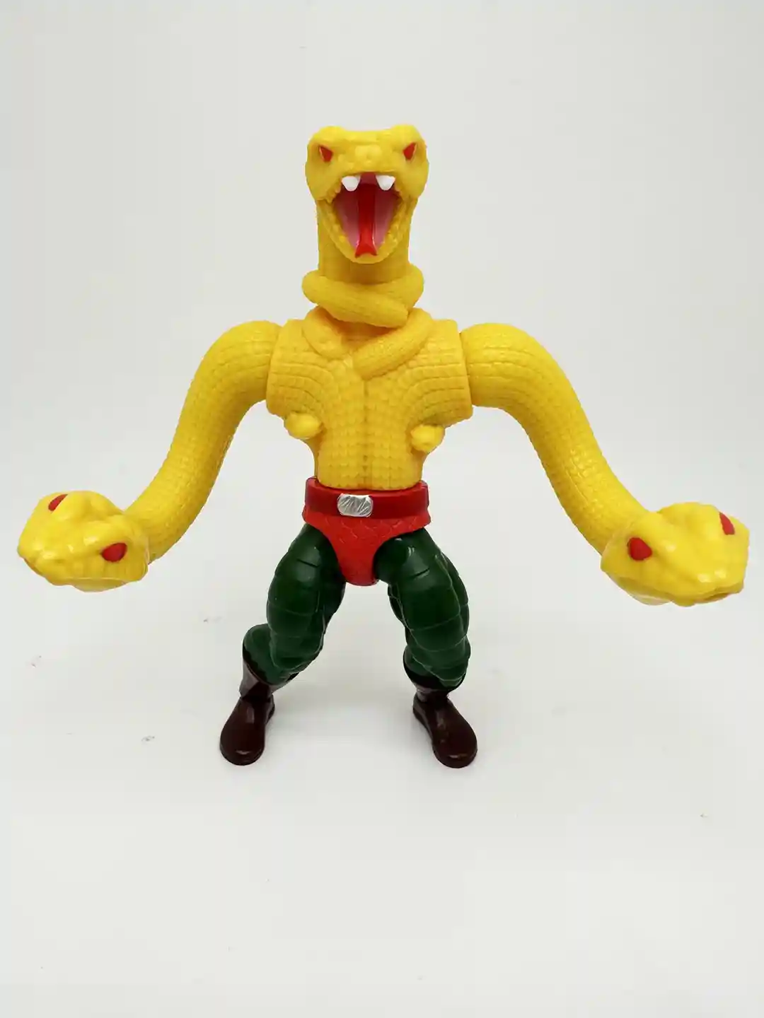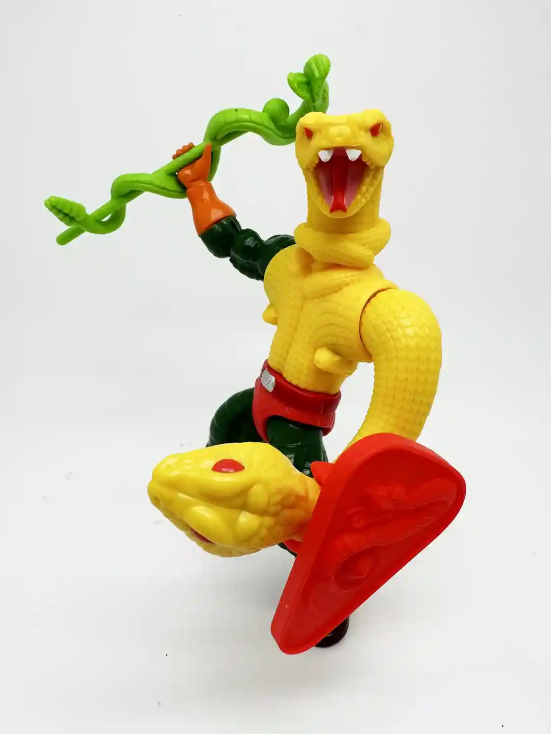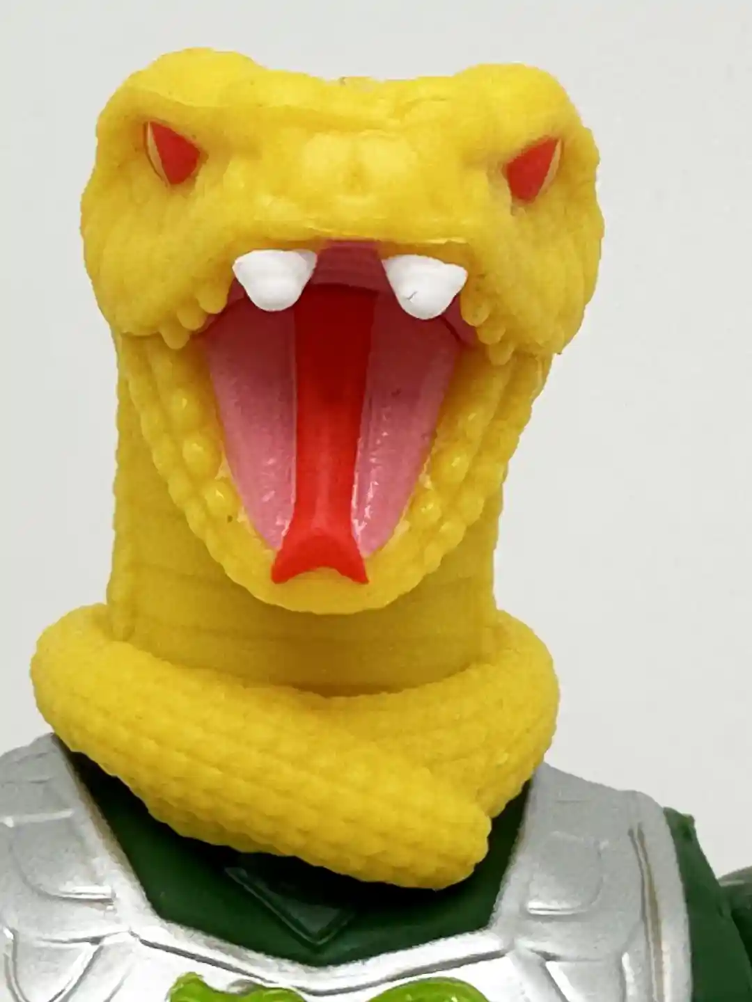 The yellow snake arms are arriculated both at the shoulder and the “hand” which is the snake head. They are very detailed with snake scales and red eyes on thee snake head. The snake head does swivel as well.